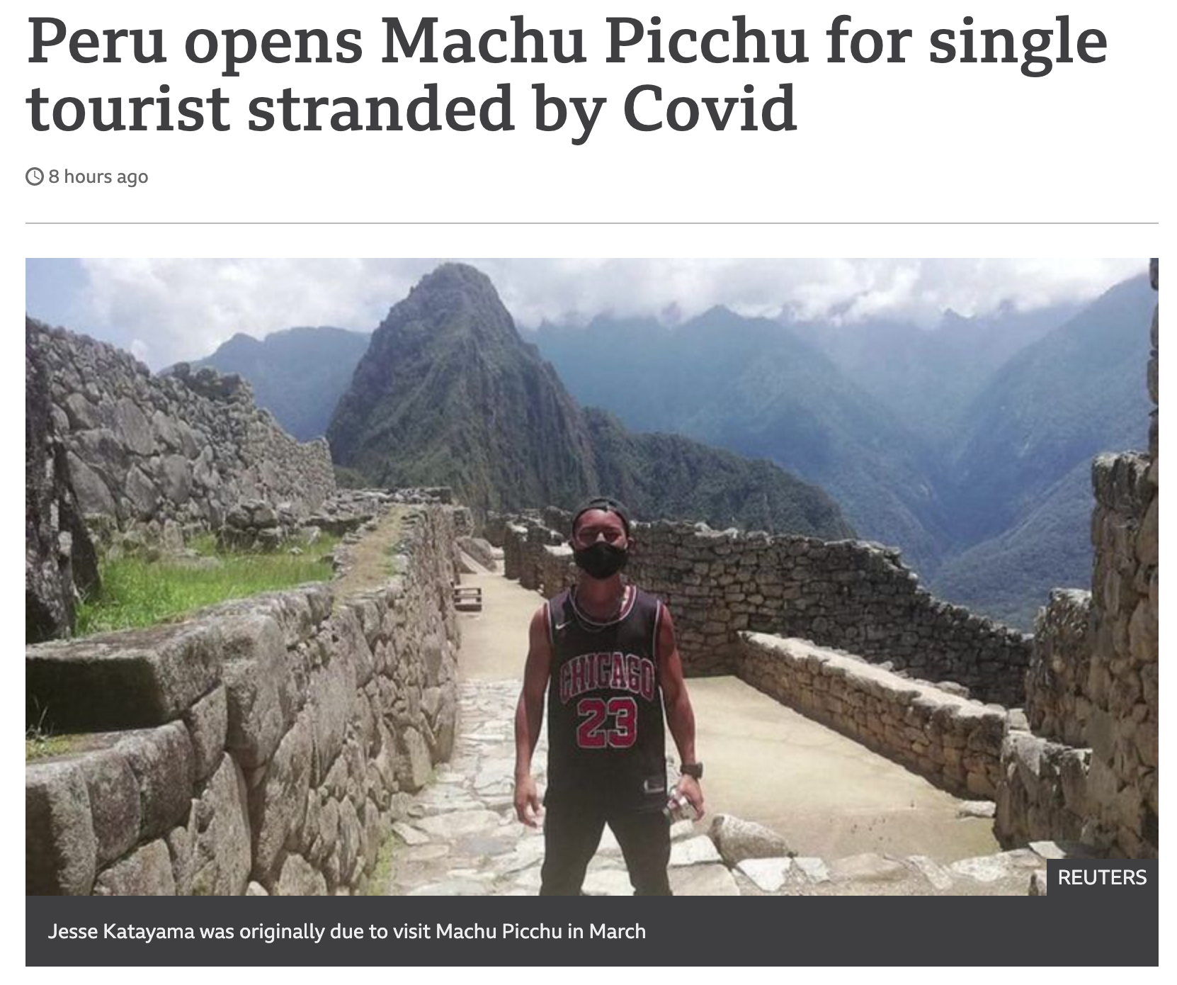 오늘은 재미있는 기사 하나를 읽었다. 코로나 상황이 심각해지기 직전에 페루로 여행갔던 한 일본 관광객이 그동안 페루에 발이 묶여 있었다고 한다. 그러다가 오늘 페루 정부는 그 일본인 한 사람에게만 마추피추를 개방해줬다고 한다. 이 얼마나 재밌으면서 훈훈한 소식인가.