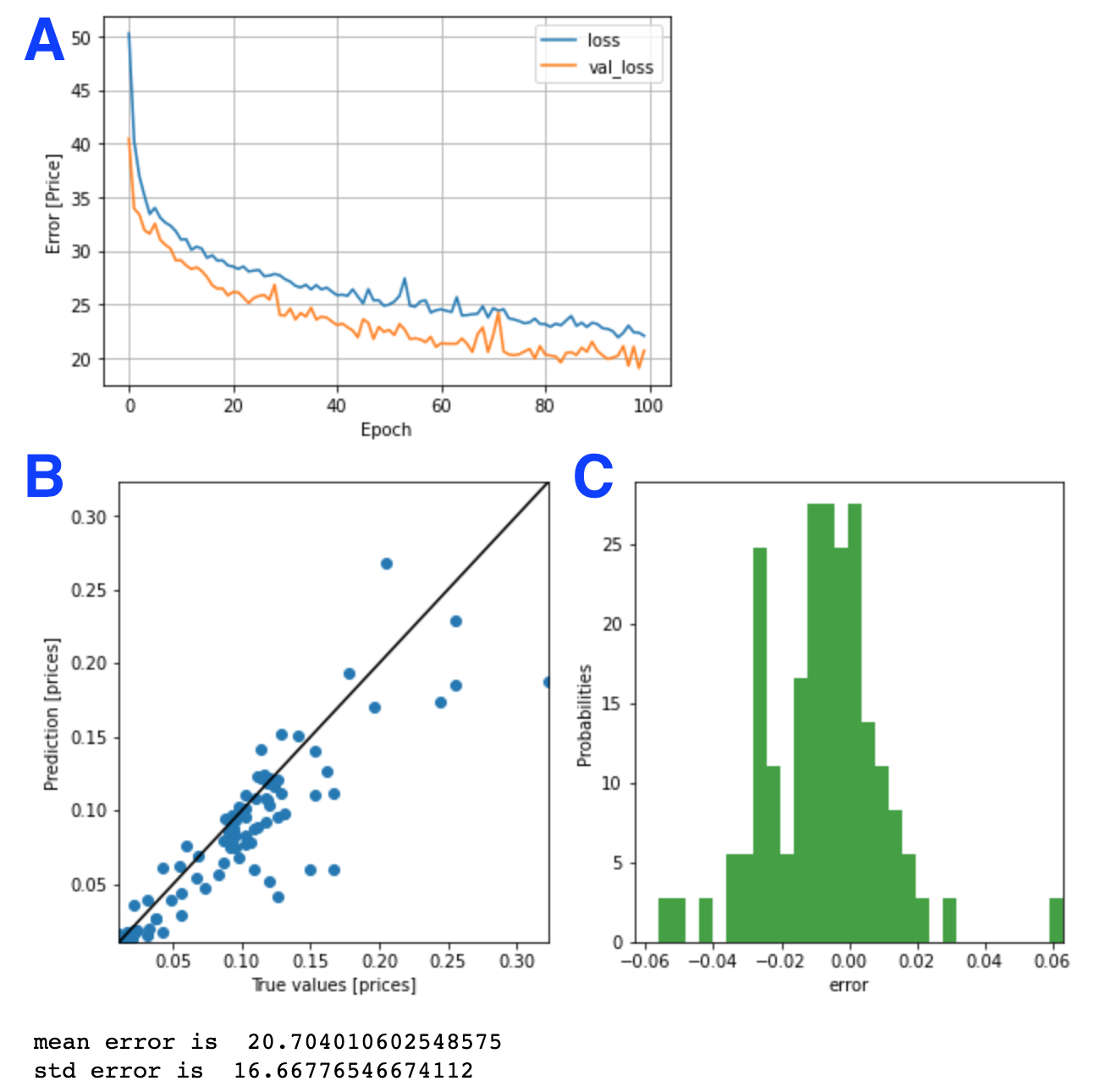 위의 결과에서 A는 train loss와 검증 loss의 변화를 보여준다. B와 C는 훈련이 끝난 모델을 검증 데이터로 평가한 결과를 보여준다. 평균적인 오차는 20.7%가 나왔다. 즉, 정확도는 약 80%이다. 꽤 괜찮은 정확도이다.