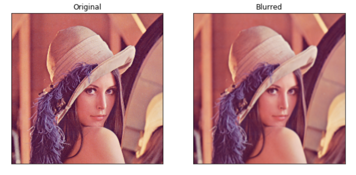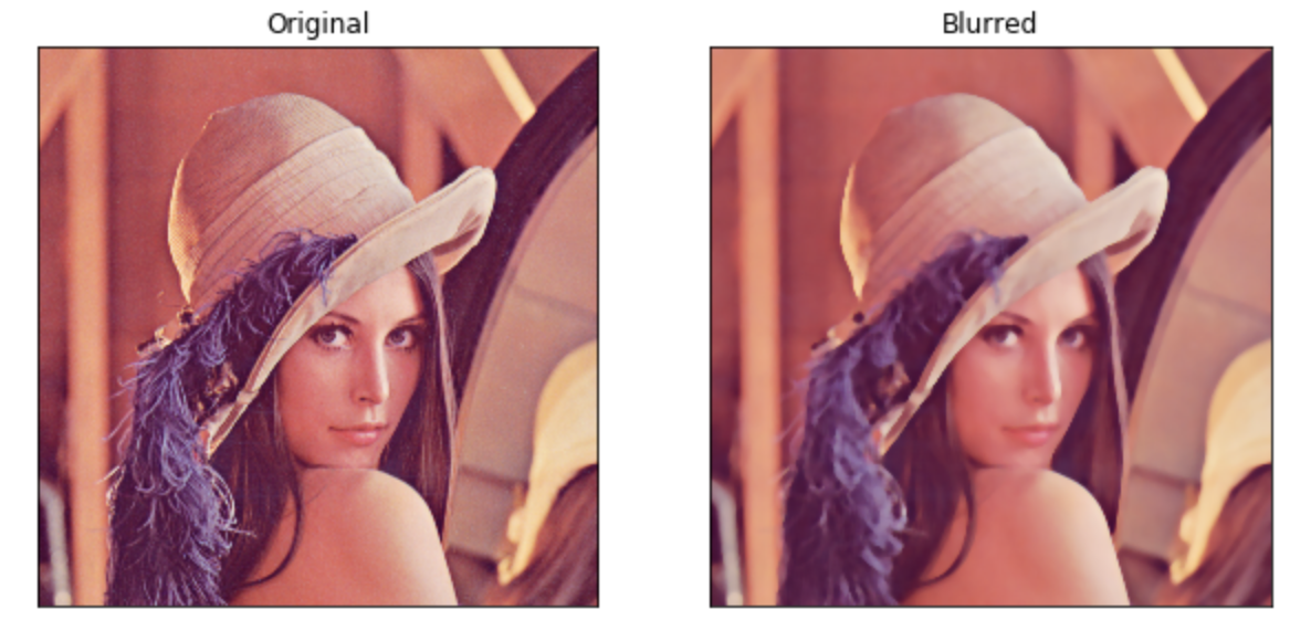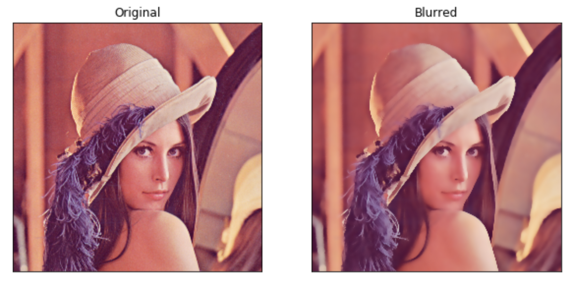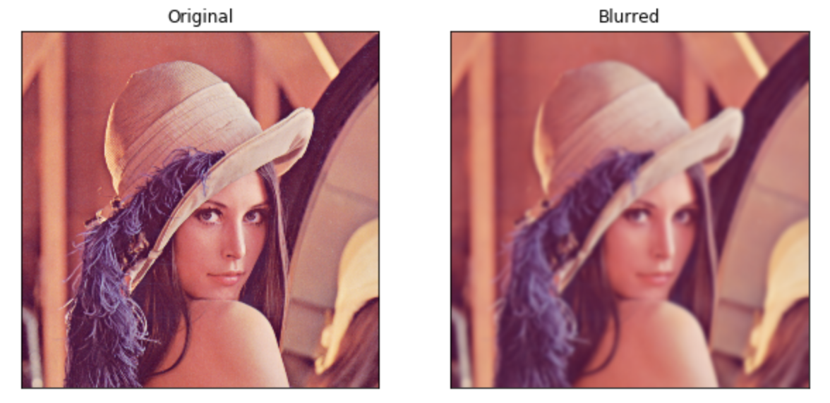 plt.subplot를 사용했고, 121 즉, 1x2 격자의 1번째 (1,1)에는 원본 그림을 출력하고, 122 (1,2)에는 blurred 이미지를 출력한다. 두 이미지를 나란히 놓고 비교할 수 있다.