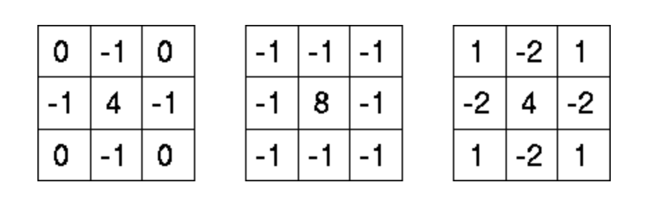 실제 이미지 처리에서는 불연속적으로 근사된 라플라스 필터를 이미지에 합성곱으로 적용한다. 여기에 사용되는 라플라스 필터는 이미지보다 크기가 훨씬 작다. 주로 3x3의 행렬이 쓰인다. 다음의 세 종류가 보통이다.