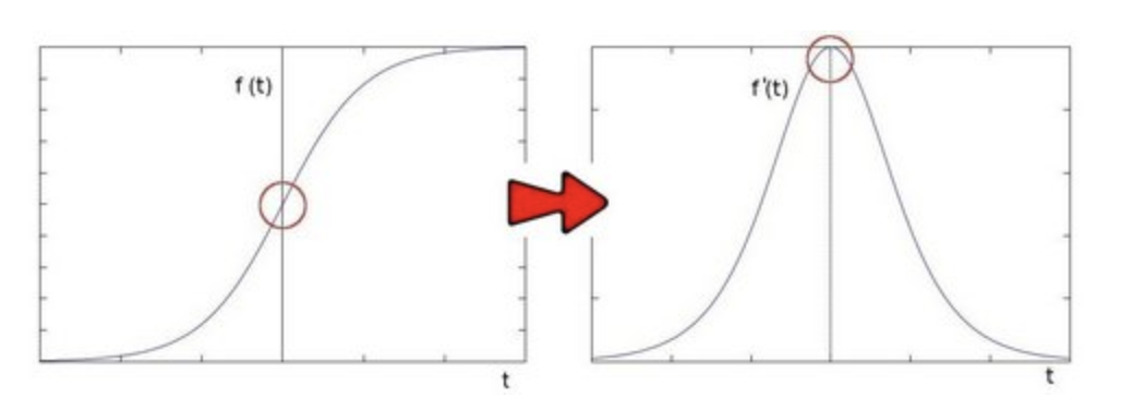 2차 미분을 하면 아래와 같이 변곡점에서 0이 되는 지점을 찾아낸다. 이것을 바로 픽셀값이 급격히 바뀌는 즉 이미지 내의 edge로 간주하고, edge 주변으로 픽셀 값이 역시 크게 변하는 것을 알 수 있다.