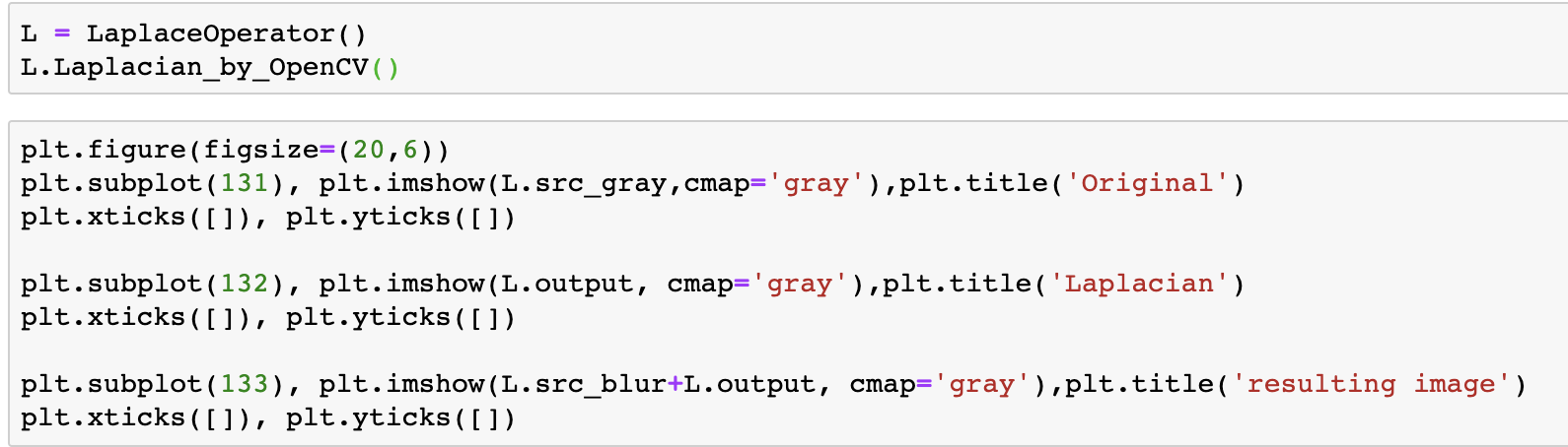 아래의 코드는 파이썬으로 이미지를 읽고 라플라스와 가우시안 필터를 적용해 본 것이다. 각 필터링에 두가지 방법, OpenCV이용한 것과 직접 짠 코드, 를 사용하여 결과를 비교하였다.