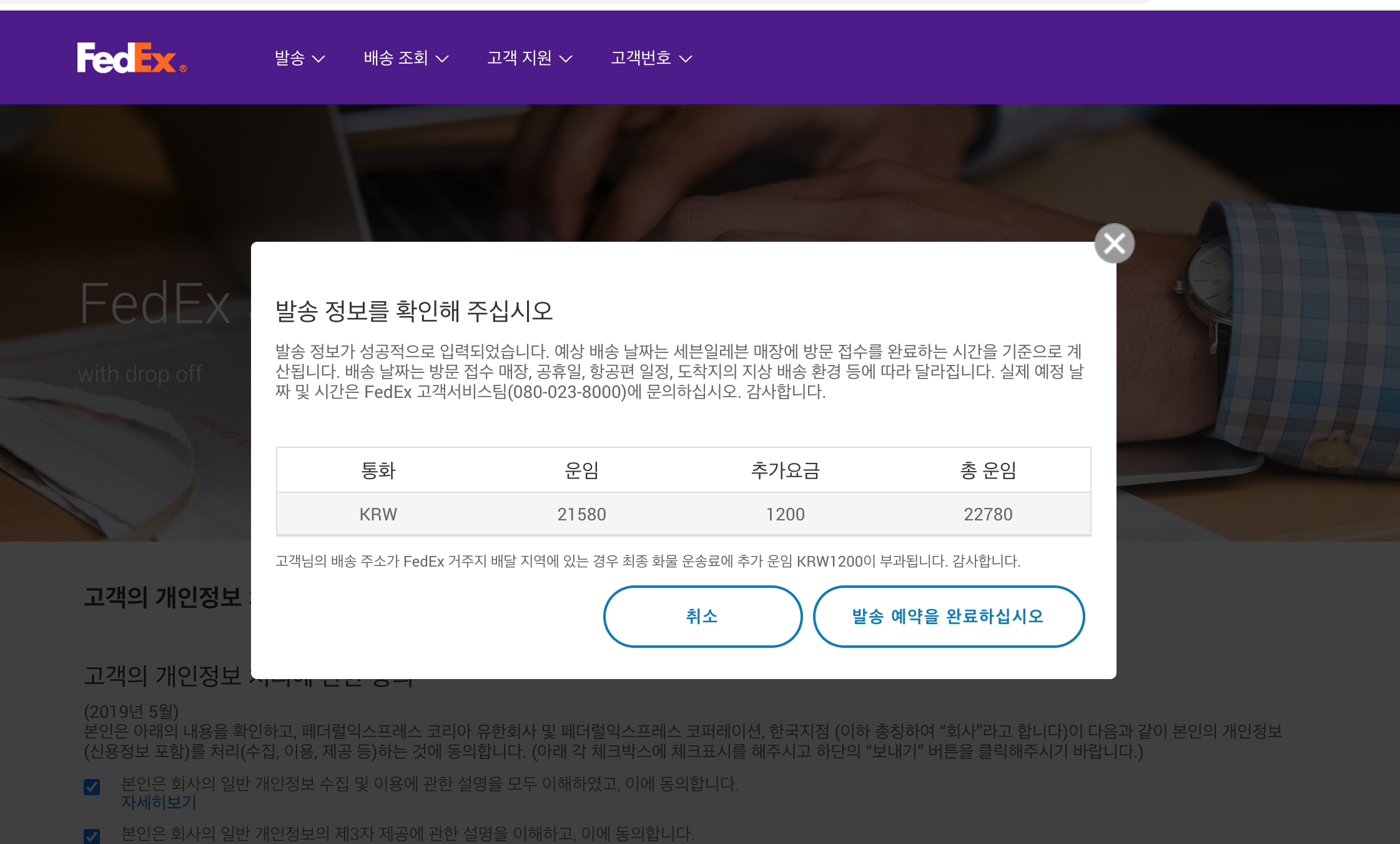 발송 정보를 확인한다. 총운임이 22,780원이다. EMS보다 크게 비싸지 않다.