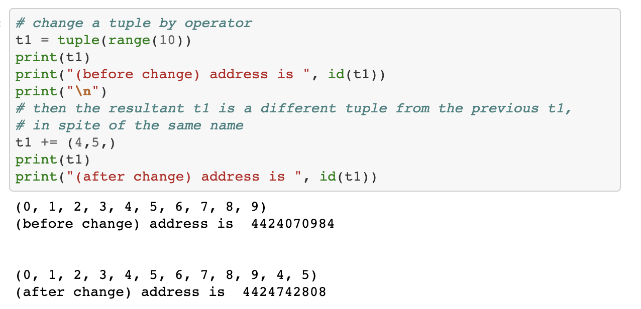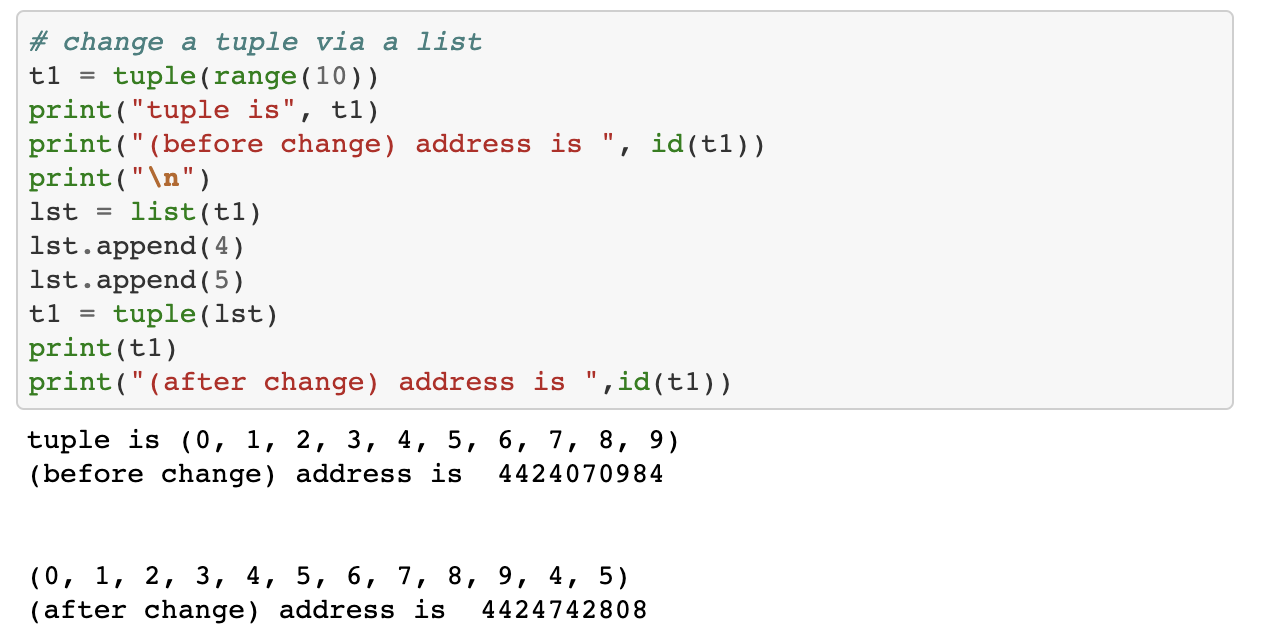 정의에 의하면 튜플은 immutable (변경 불가)한 자료형이기 때문에 한 번 정해지면 바꿀 수 없다. 하지만 변경하는 것에 대한 방법을 종종 보게 된다. 대표적으로