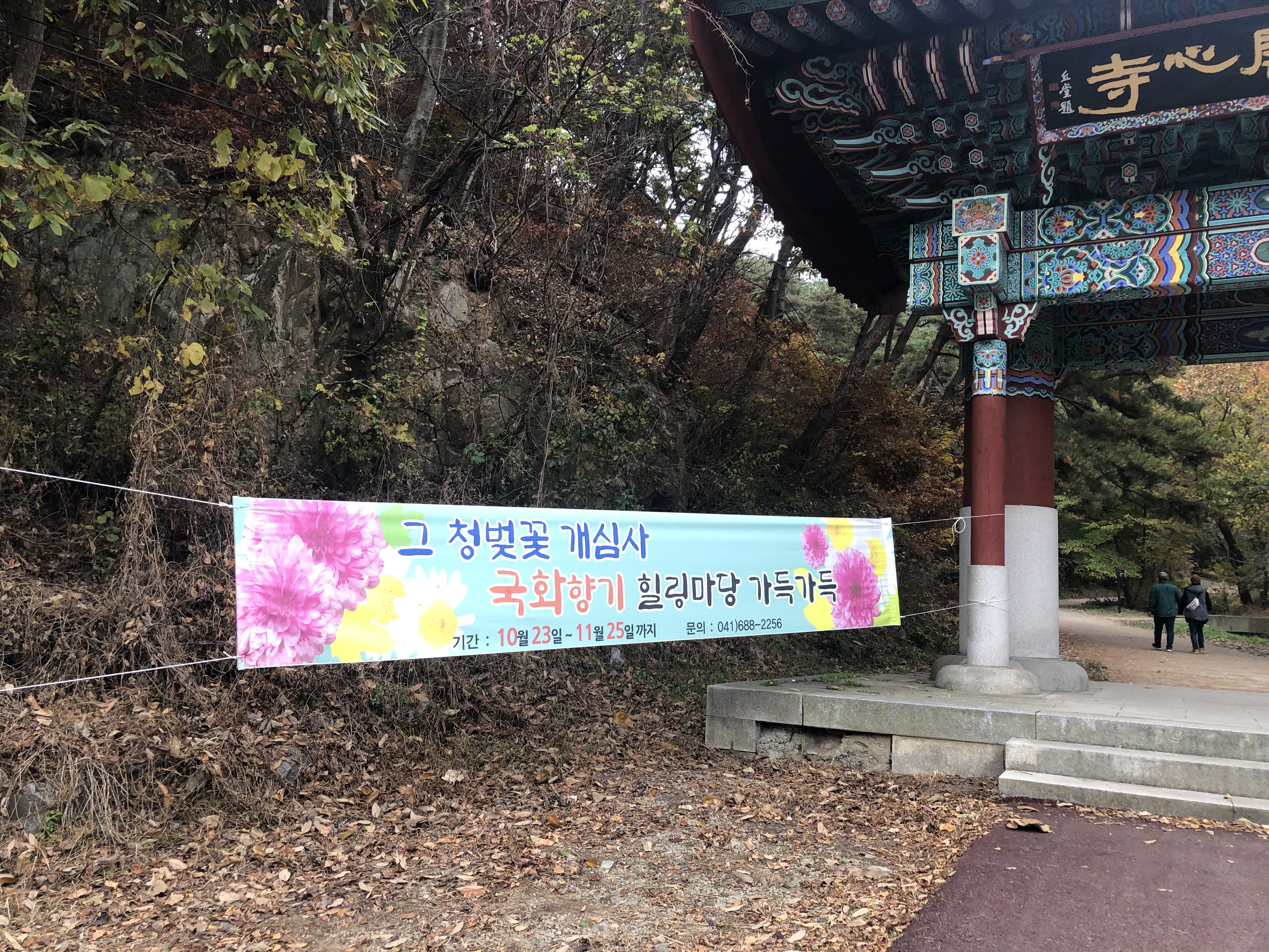 개심사 입구에 이르면 국화향기 힐링 마당이라는 광고가 붙어있다. 이제 산을 조금씩 오르면 된다.