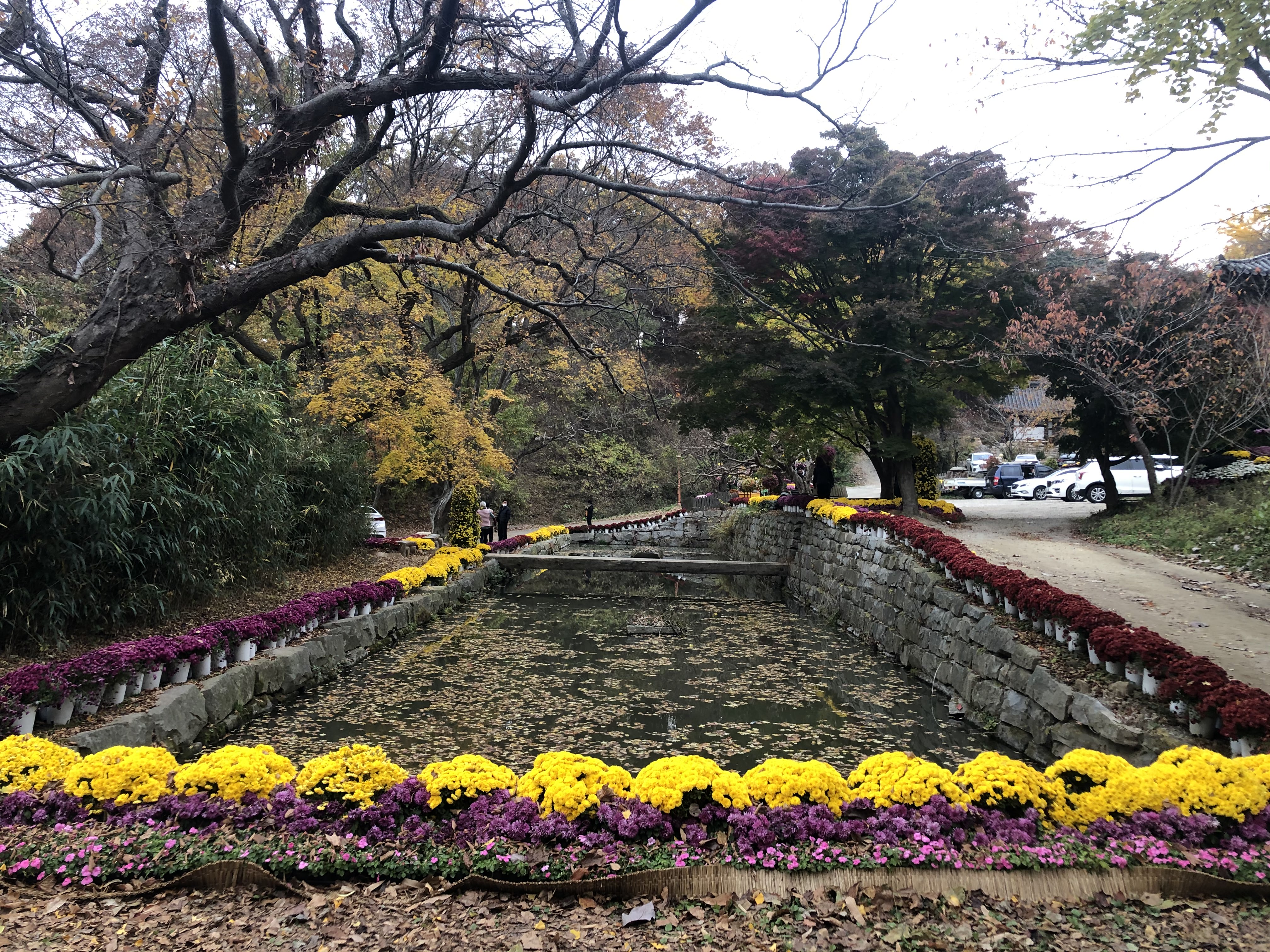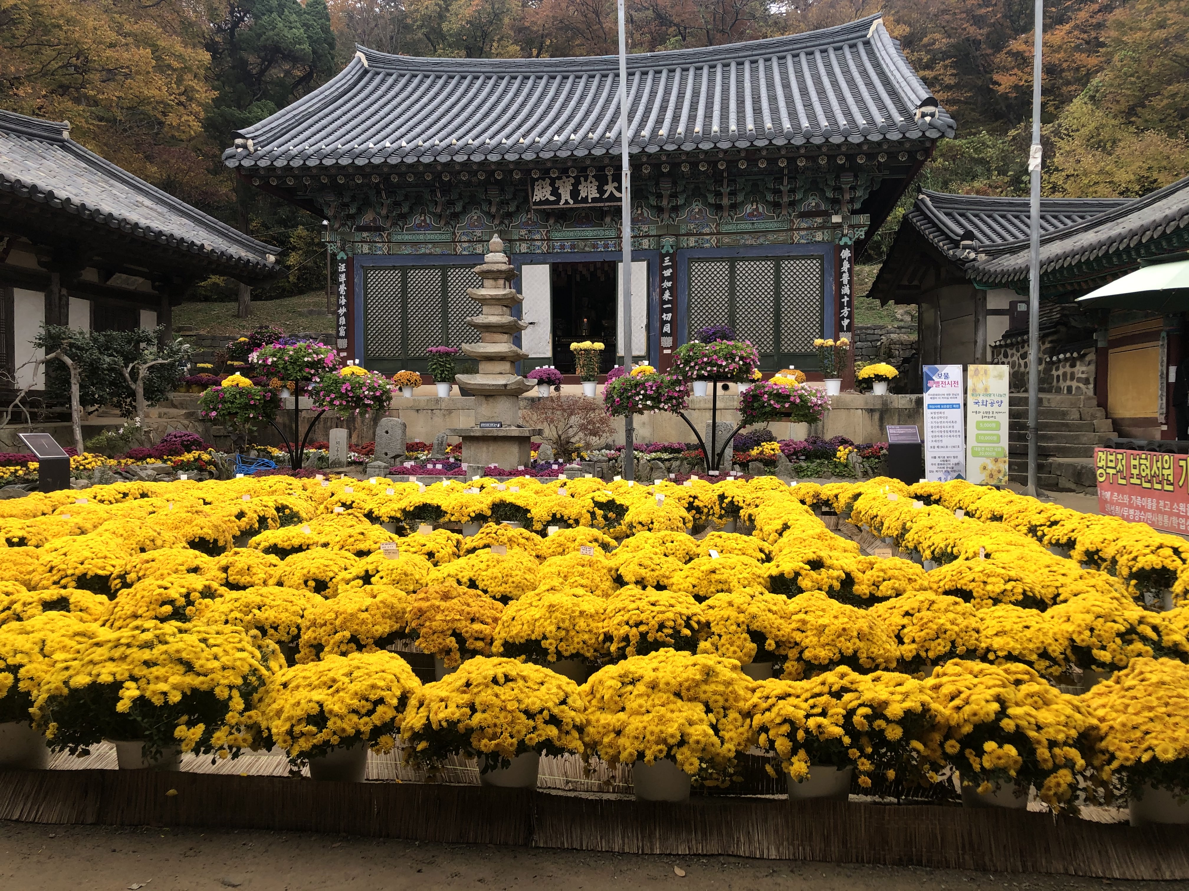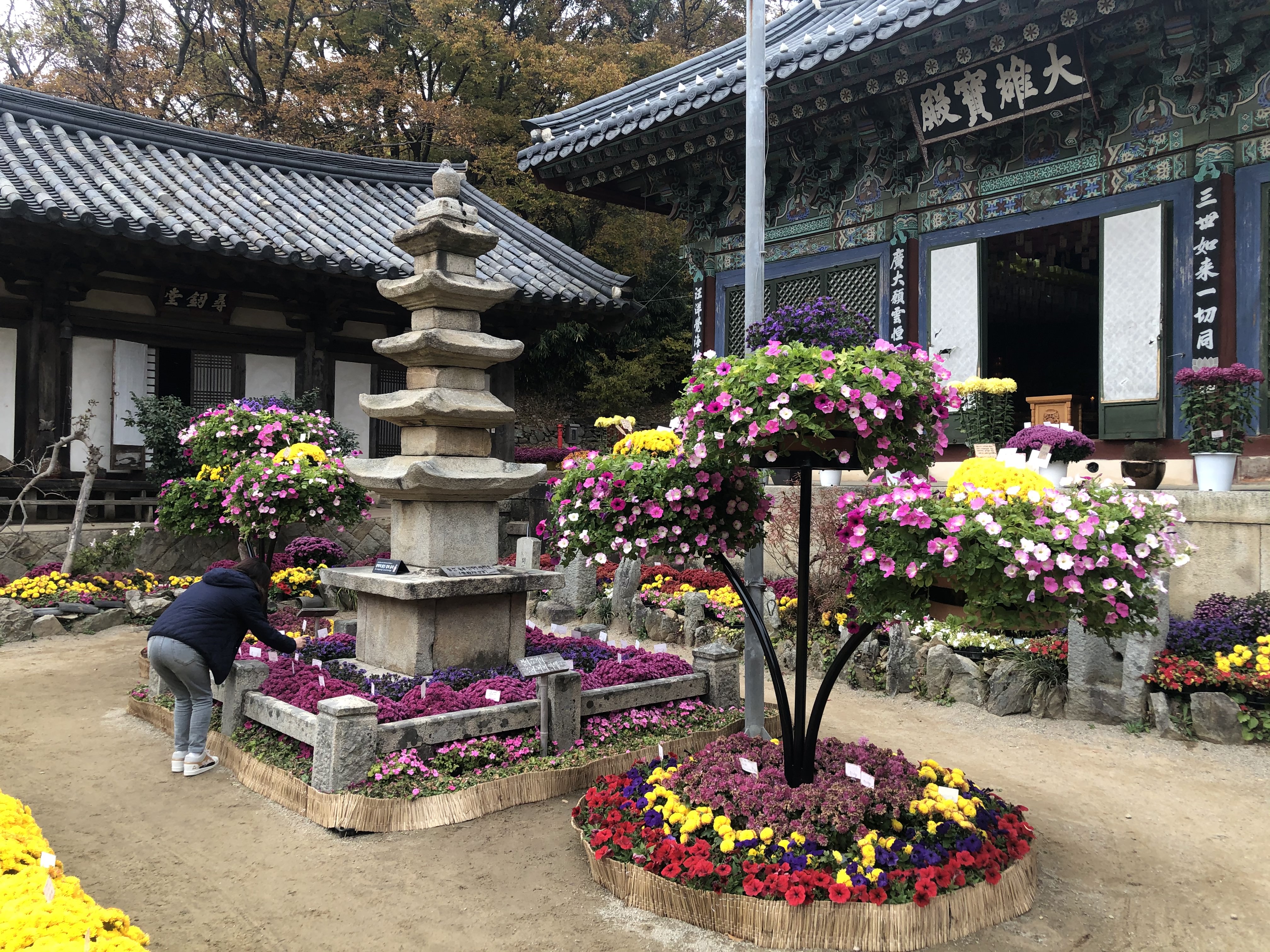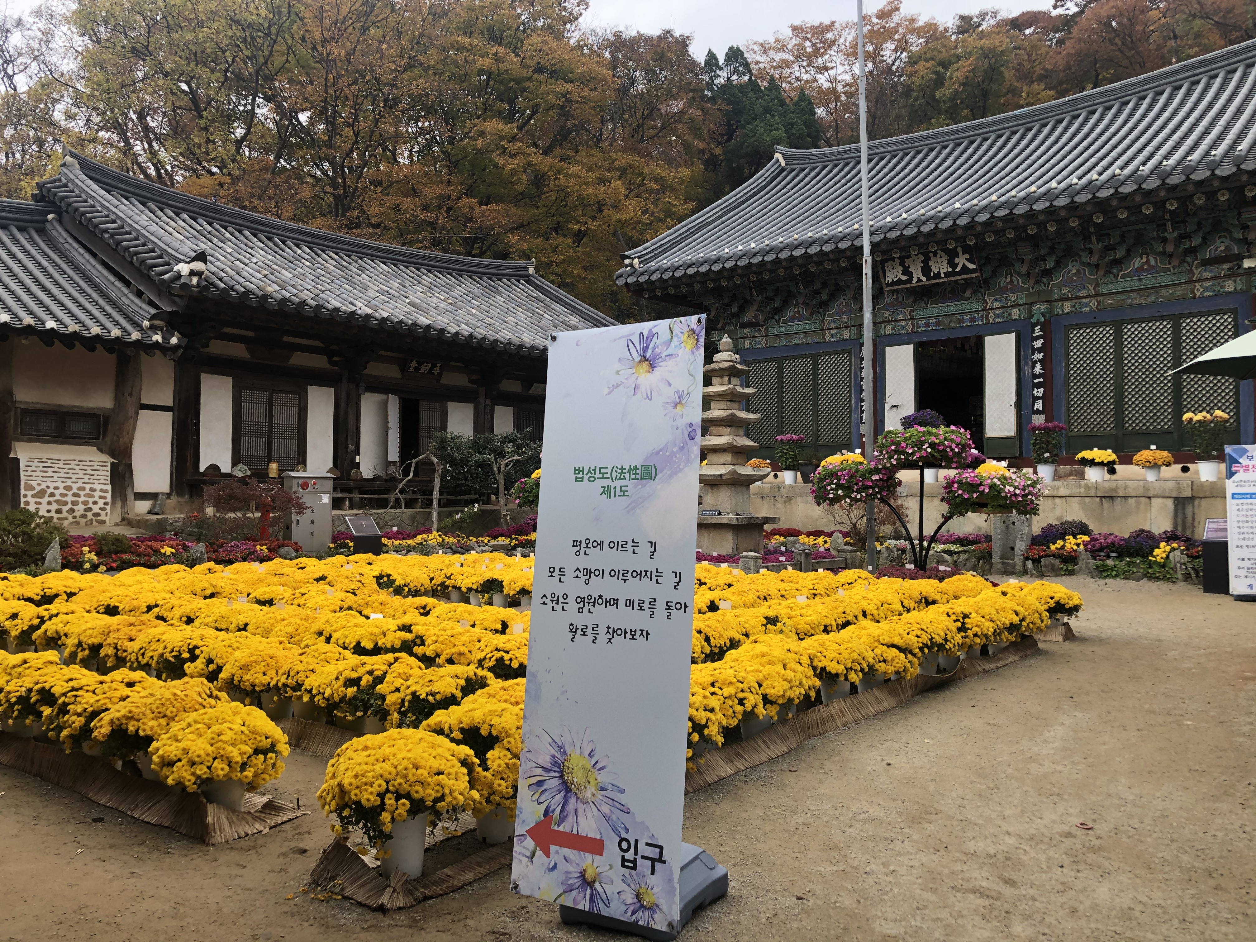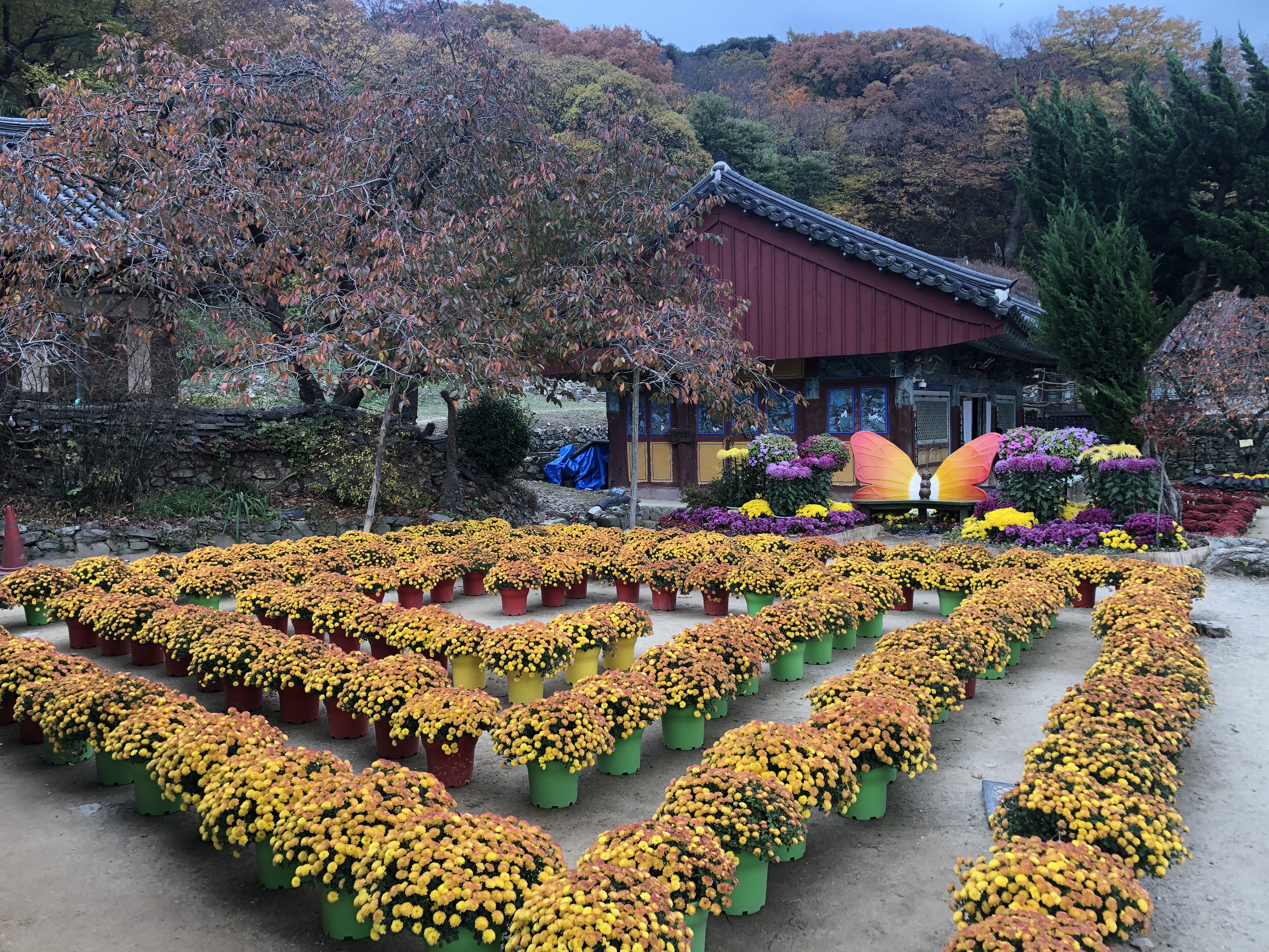 절 앞마당으로 들어오면 여기저기 아기자기 하면서도 예쁘게 꾸며놓은 국화를 만난다. 사진을 찍을 수 있게 나뭇잎 벤치로 만들어 놓았다. 아마 주말엔 줄 서서 사진들 찍을 것 같다.