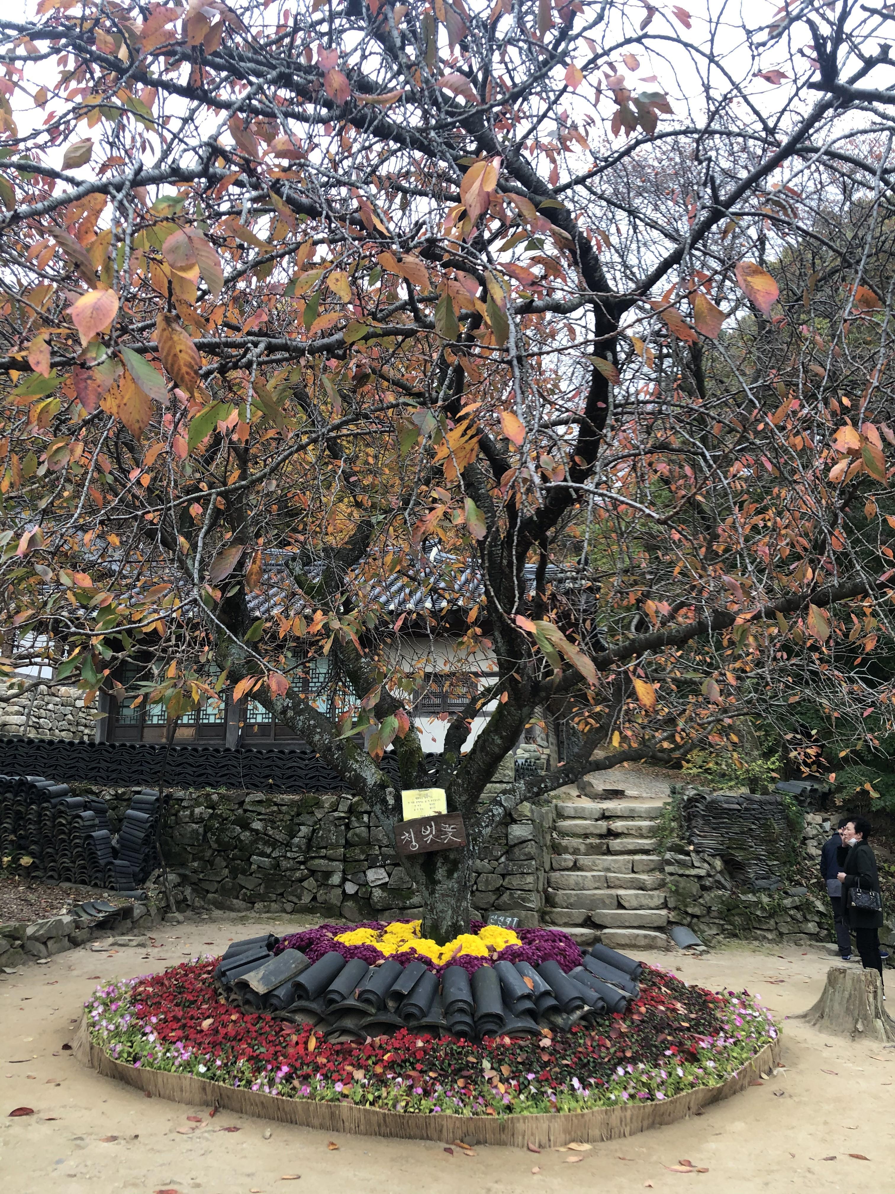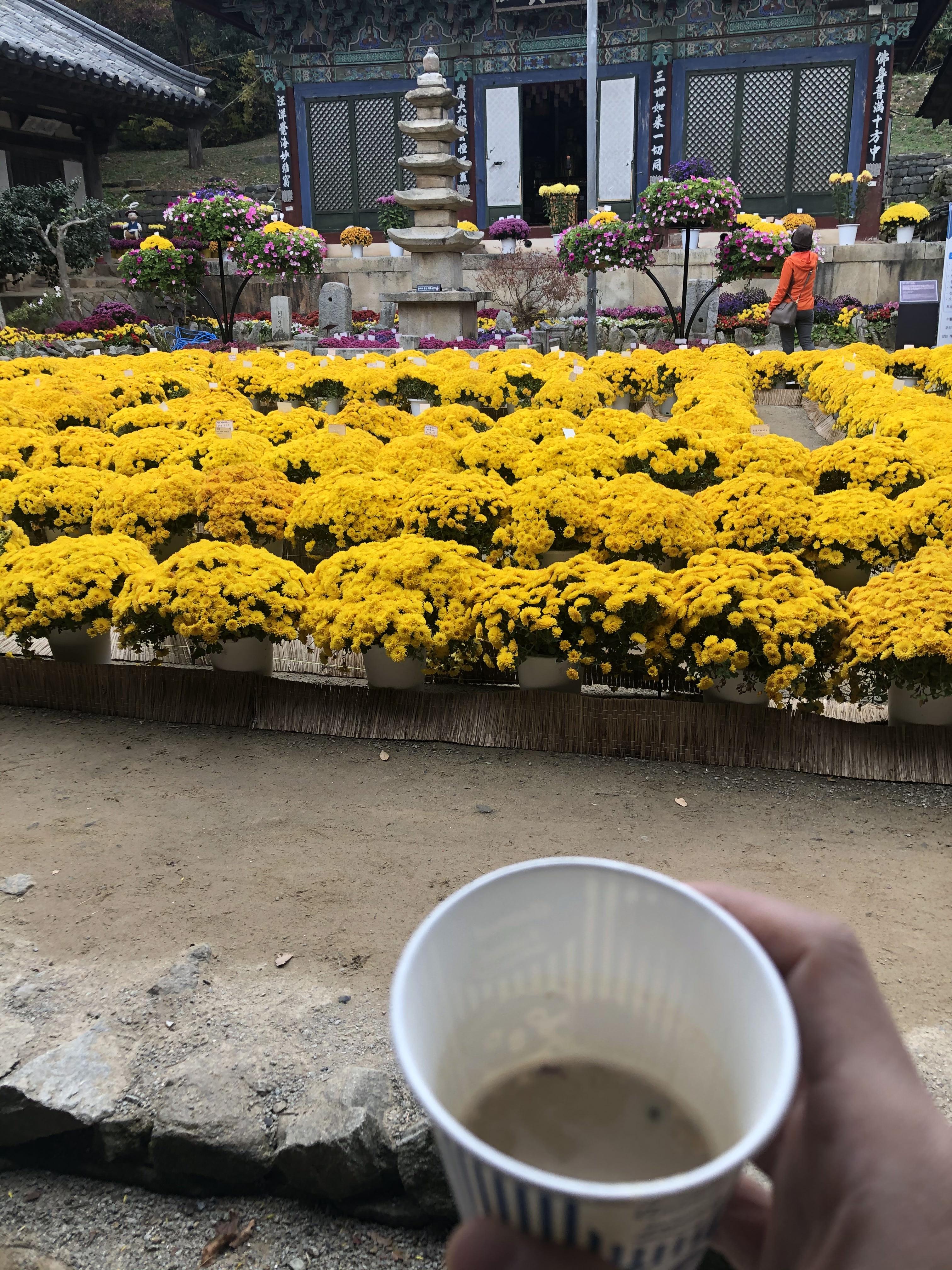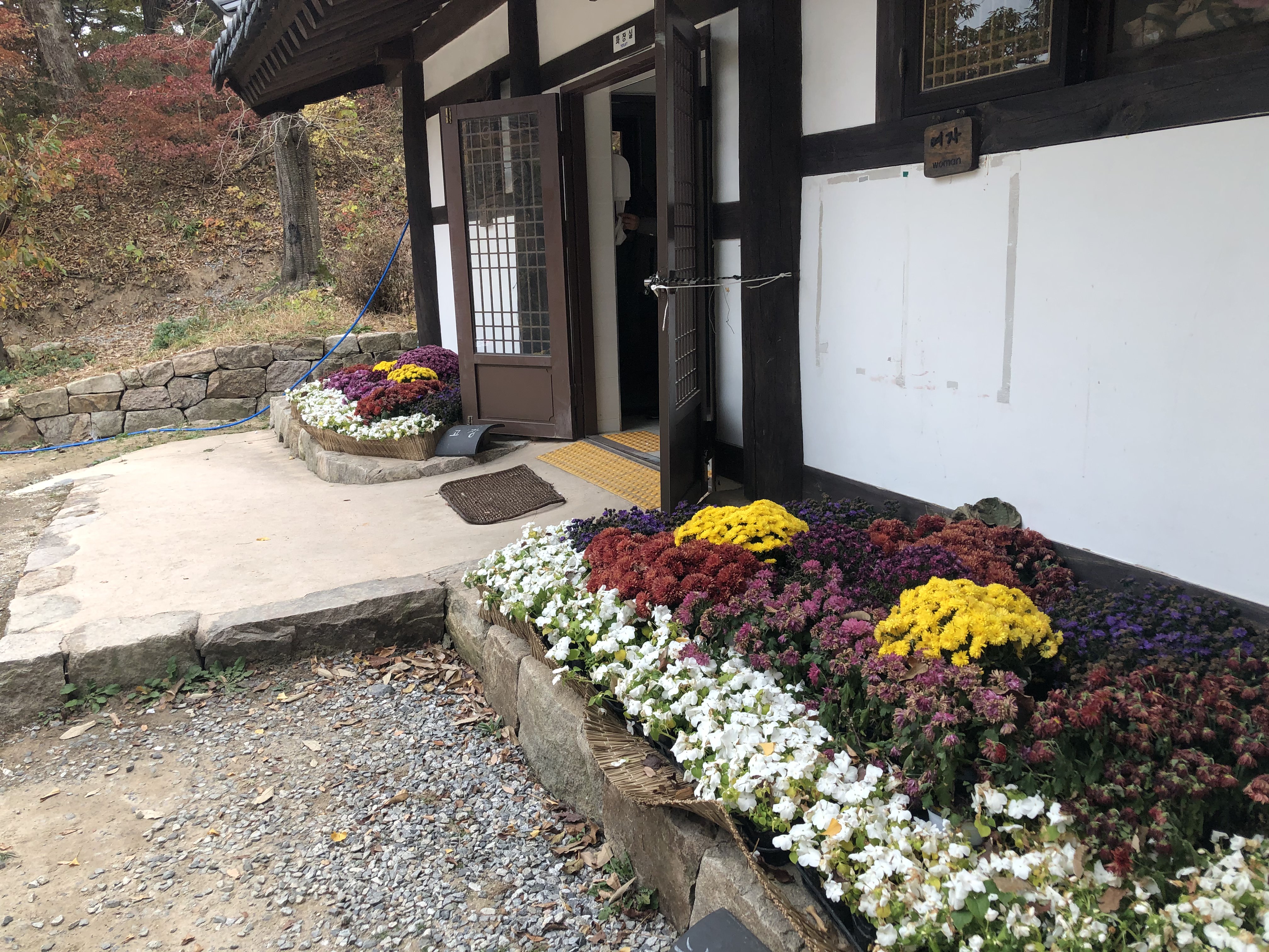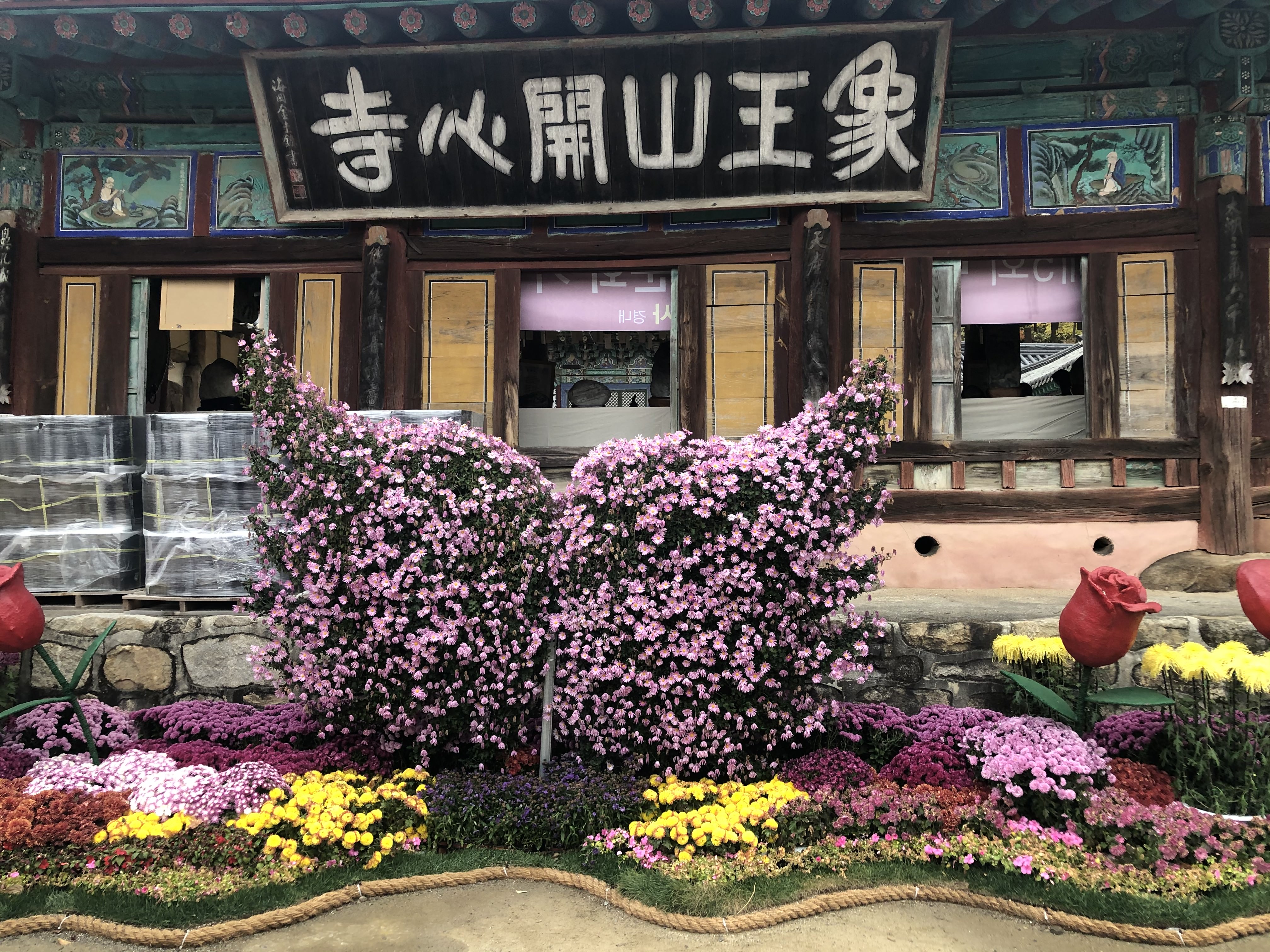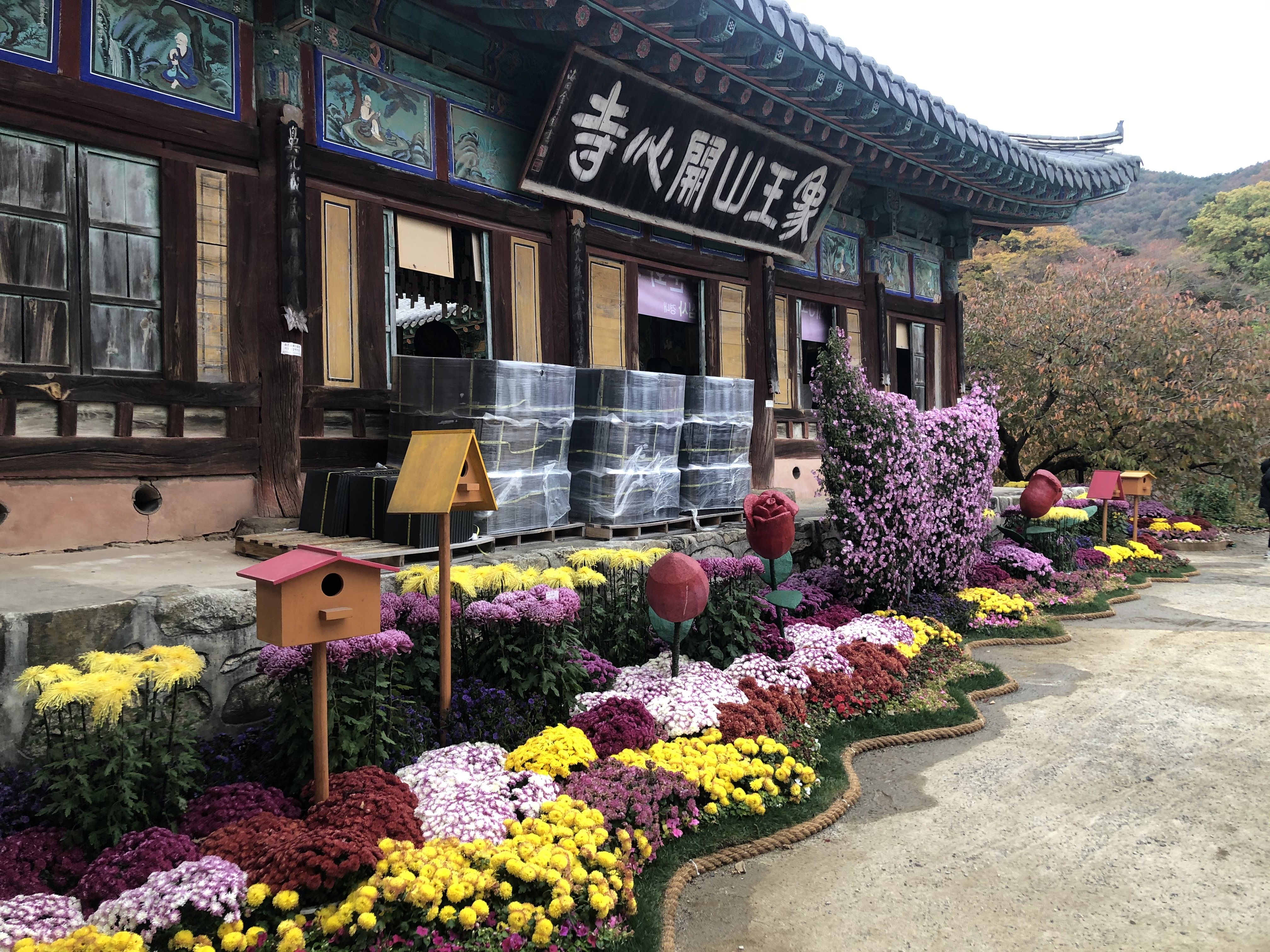 절 앞마당으로 들어오면 여기저기 아기자기 하면서도 예쁘게 꾸며놓은 국화를 만난다. 사진을 찍을 수 있게 나뭇잎 벤치로 만들어 놓았다. 아마 주말엔 줄 서서 사진들 찍을 것 같다.
