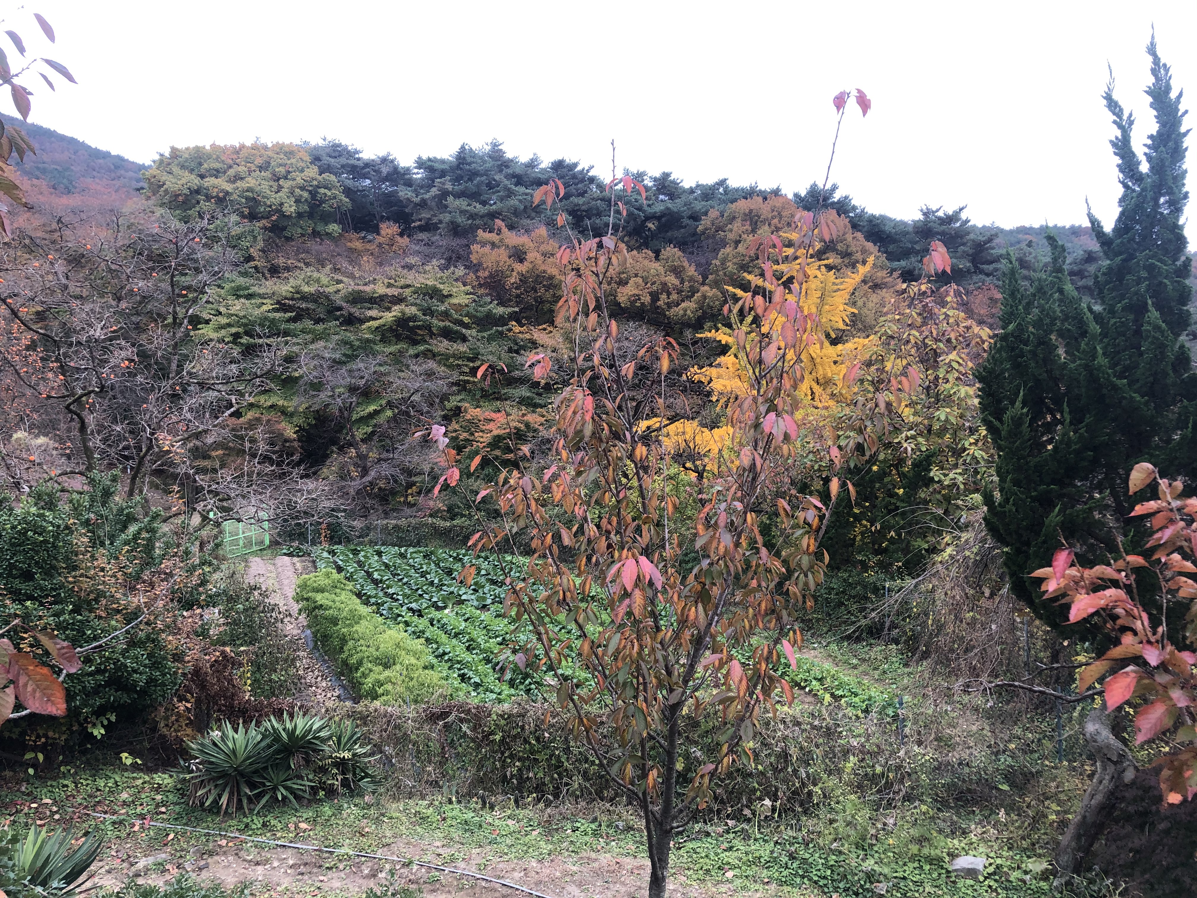 가운데 저 멀리 단풍을 물들인 청벚꽃 나무가 서있다.