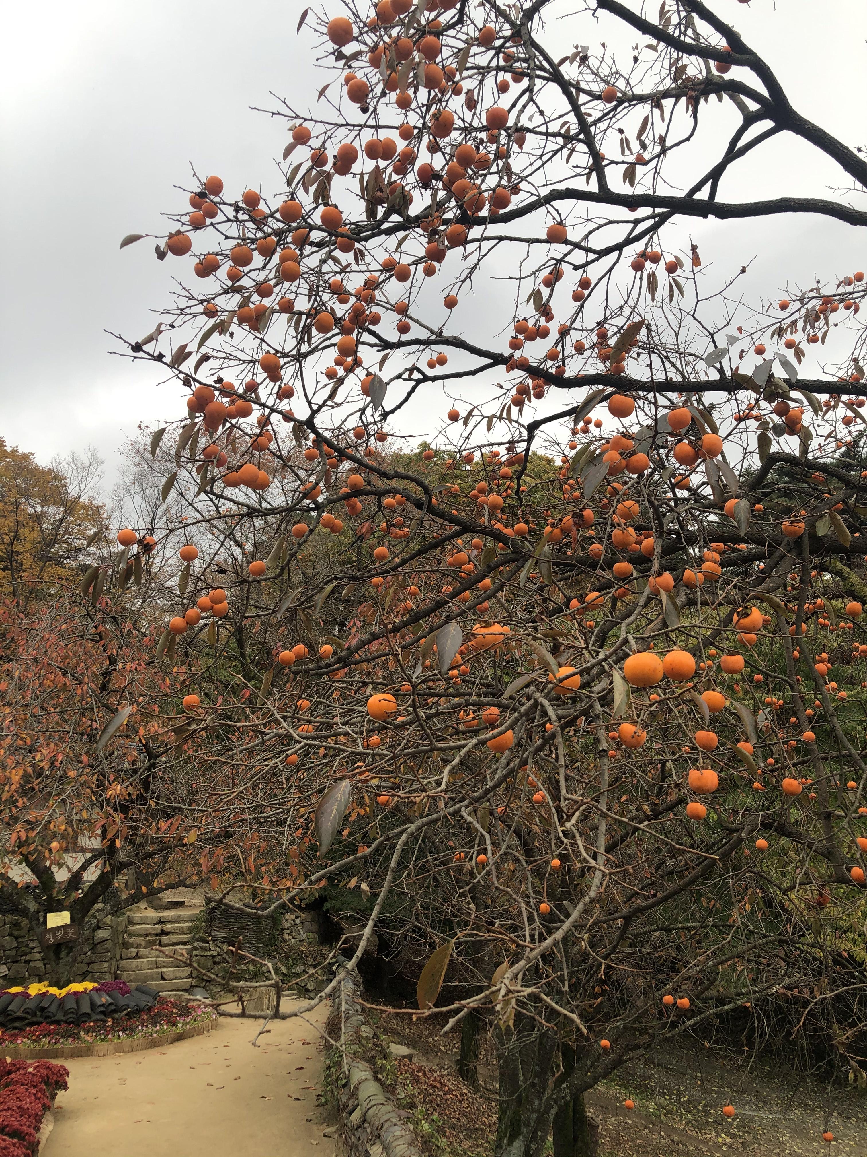 그 옆으로는 감나무에 호박 색깔 감이 창에 맺힌 물방울처럼 매달려 있다.