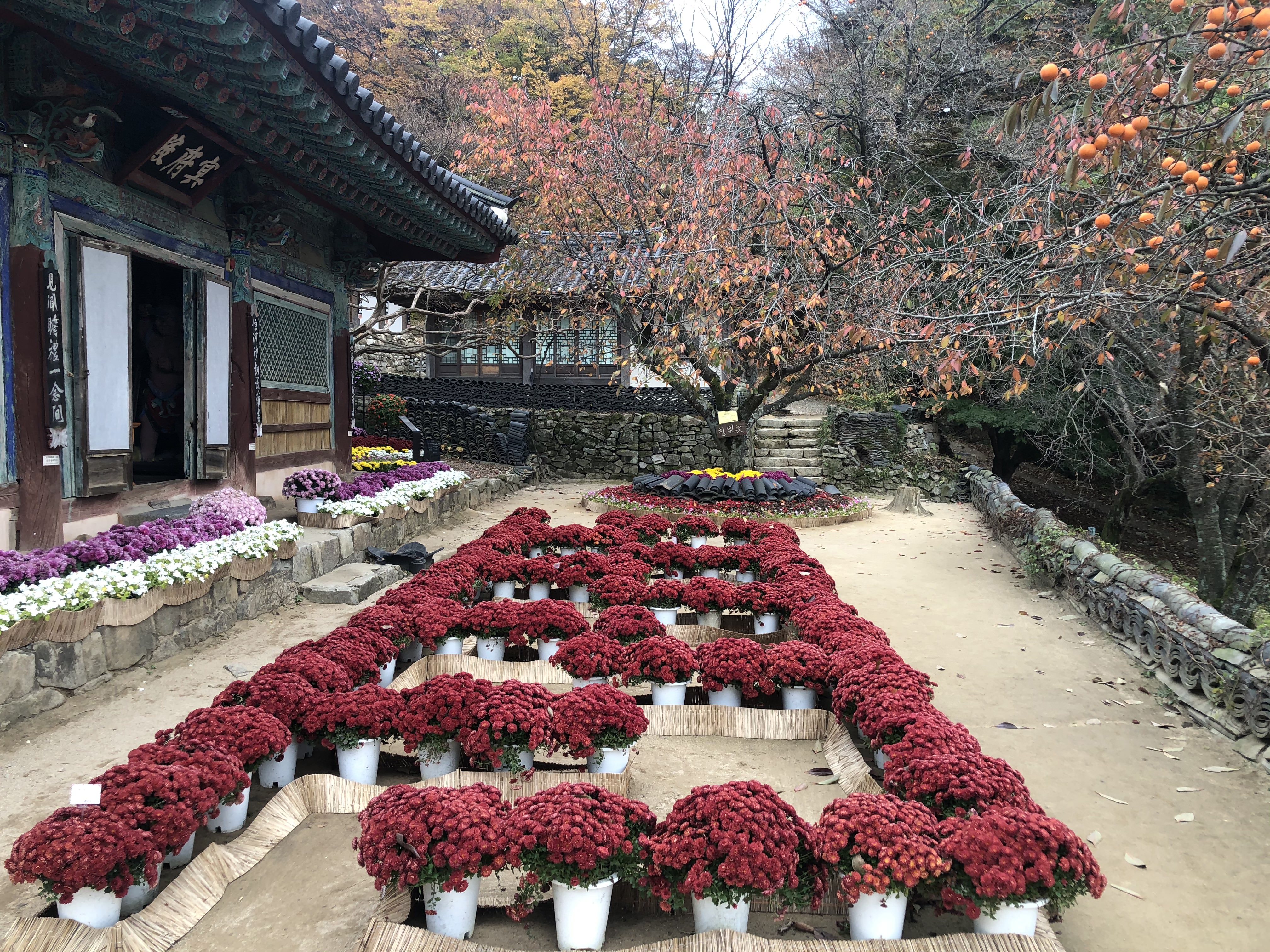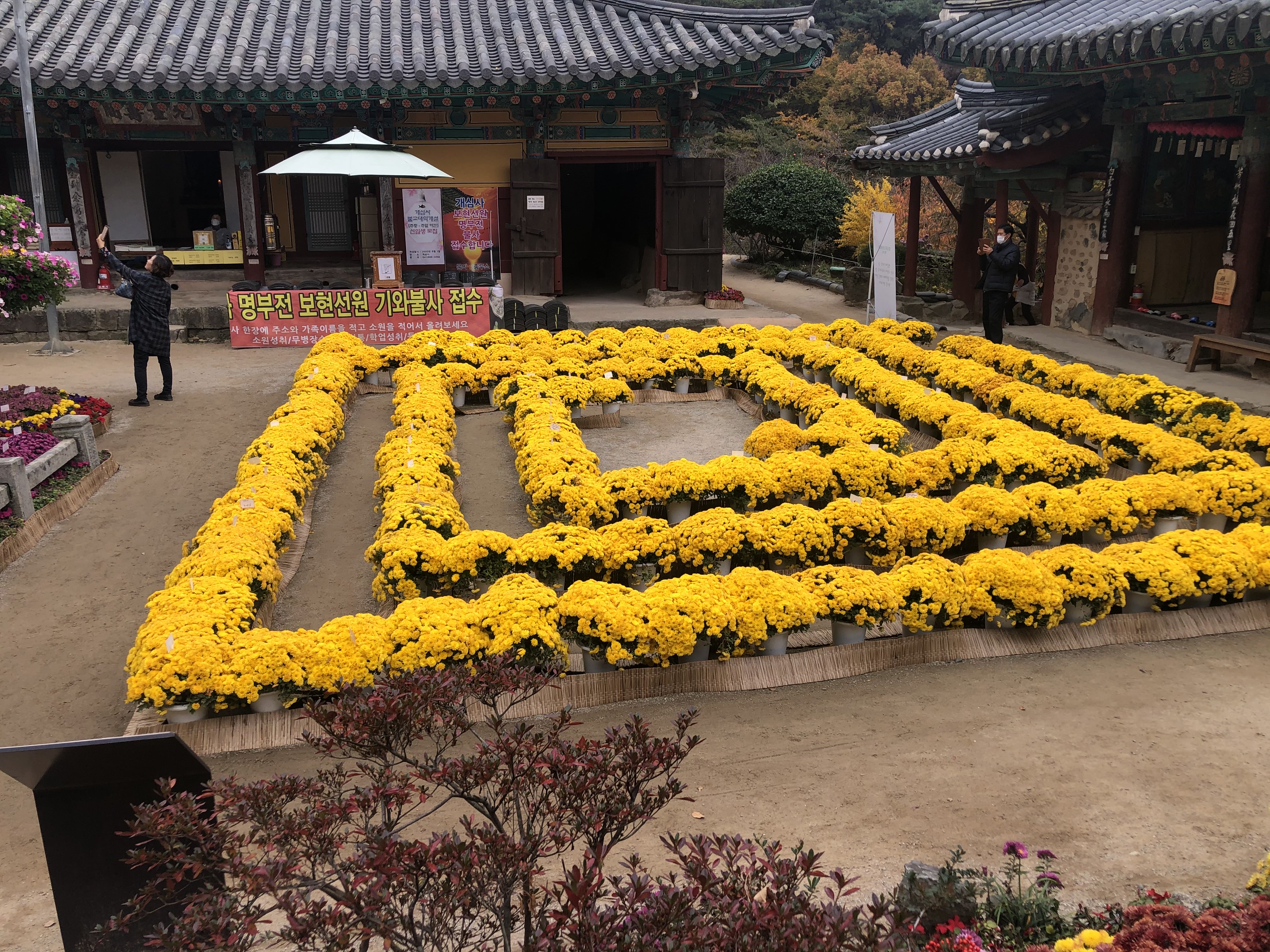 대웅전 뒷 마당은 짙은 분홍색 국화로 같은 미로를 만들어 놓았다.