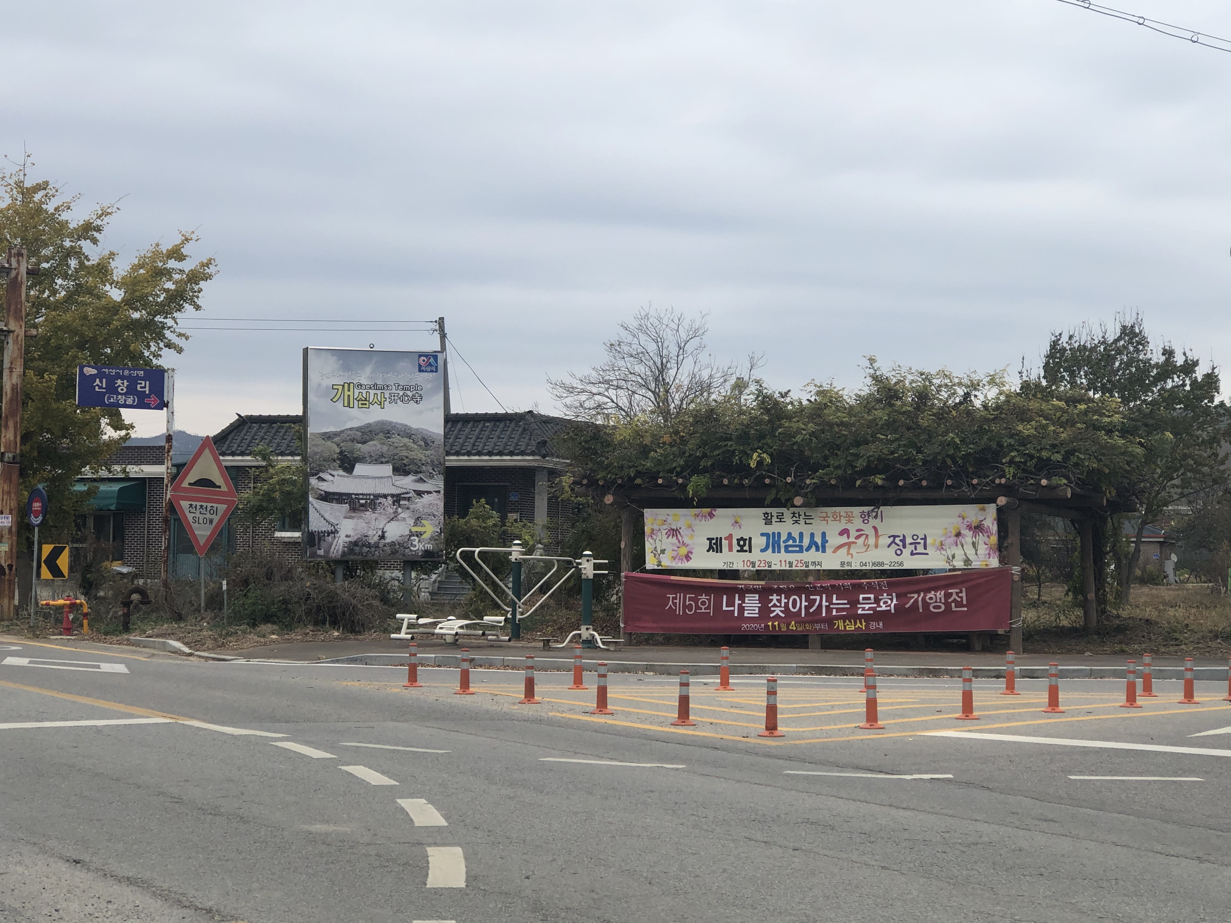 신창리의 개심사/해미읍/운산읍/관유리로 갈라지는 사거리에서 개심사란 표지와 국화축제를 알리는 광고를 볼 수 있다. 이곳을 따라 상왕산 쪽으로 깊숙이 들어간다.
