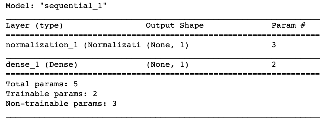 아래의 결과에서 Dense layer에서 훈련 가능한 매개변수가 2개인 것을 확인할 수 있다. 이것은 weight과 bias이다. 또한, normalization layer에 3개의 훈련 대상이 아닌 변수를 확인할 수 있다. 규격화 층에서 변수의 개수가 어떻게 정해지에 대해서는 나중에 공부하기로 하자.