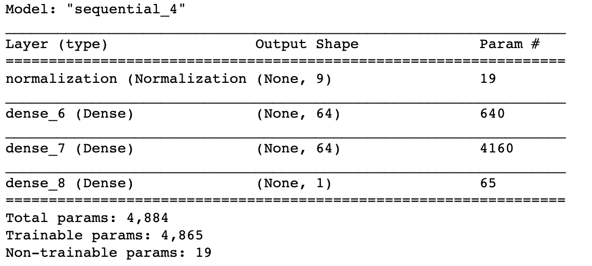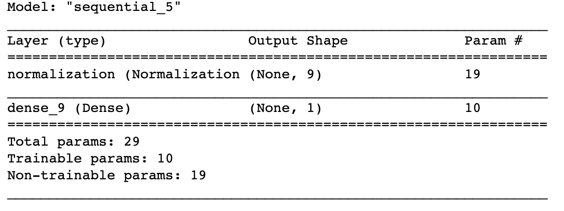 위와 같이 모델의 구조를 보면 규격화 층의 출력 변수의 개수가 9개이고 변수는 19로 늘어났다. 이것은 총 9개의 feature를 사용한다는 것이고 19개의 훈련하지 않아도 되는 변수가 생성되었음을 뜻한다.