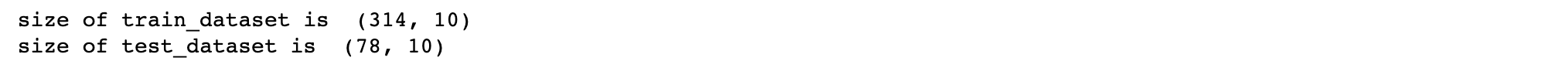 자 다음으로는 데이타를 훈련과 검증 세트로 나누어 준다. 대개 훈련과 검증 각각 80%과 20%의 비율로 나눈다. 여기에서는 pandas dataframe의 sample 매서드를 이용해 dataset의 80%를 train_dataset으로 할당하였고, 이때 random_state는 0으로 주었다. 따라서 dataset의 앞 80%가 훈련 세트로 지정된다. 나머지 20%은 검증을 위한 세트가 된다.
