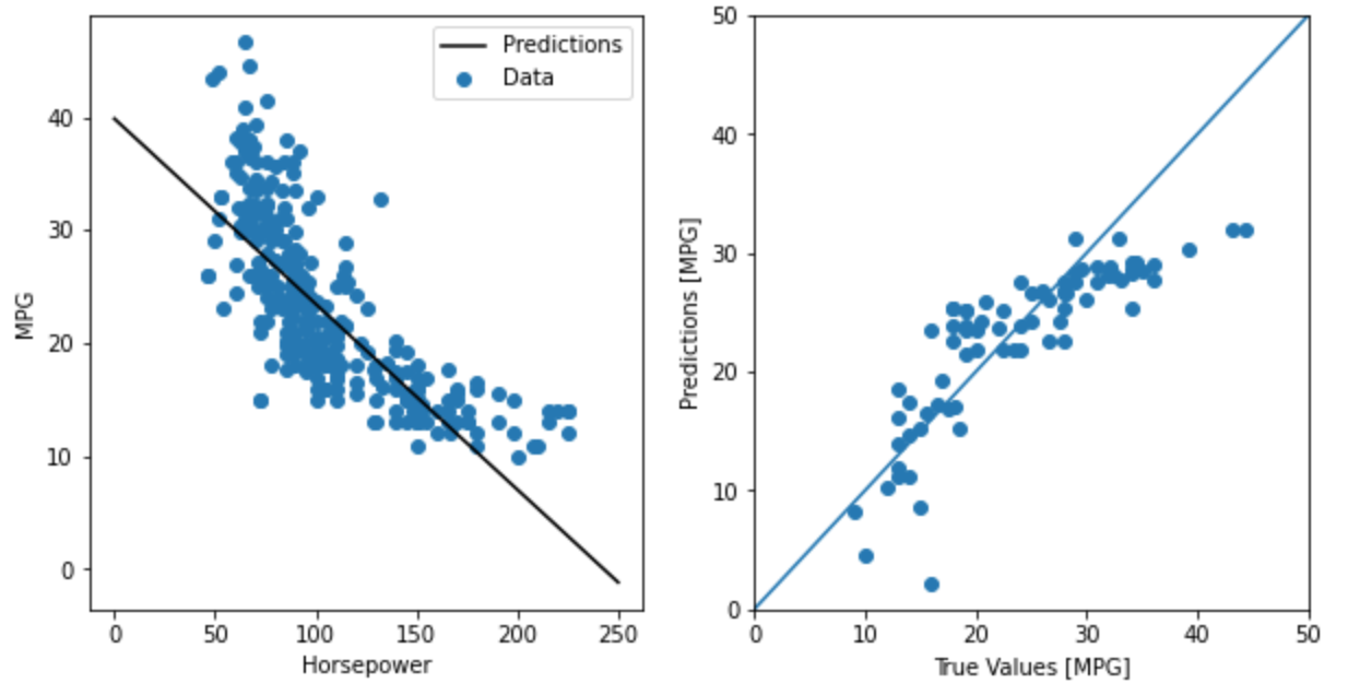 훈련 결과를 horsepower vs. MPG 데이타에 피팅을 통해 확인해 볼 수 있다.