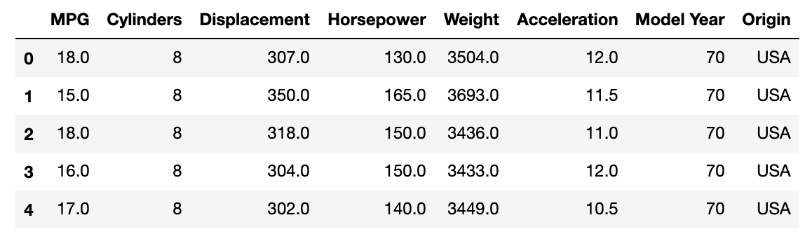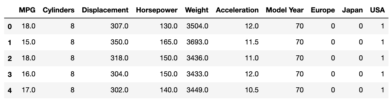 칼럼명을 보면, MPG는 miles per gallon이고, displacement는 이동거리, Horsepower는 마력이 되겠다. 마지막에 Origin은 엔진을 만든 국가를 나타낸다. 1은 USA, 2는 Europe, 그리고 3은 Japan이다. 이것은 preprocessing 과정에서 원 핫 형태로 변형시킬 것이다.