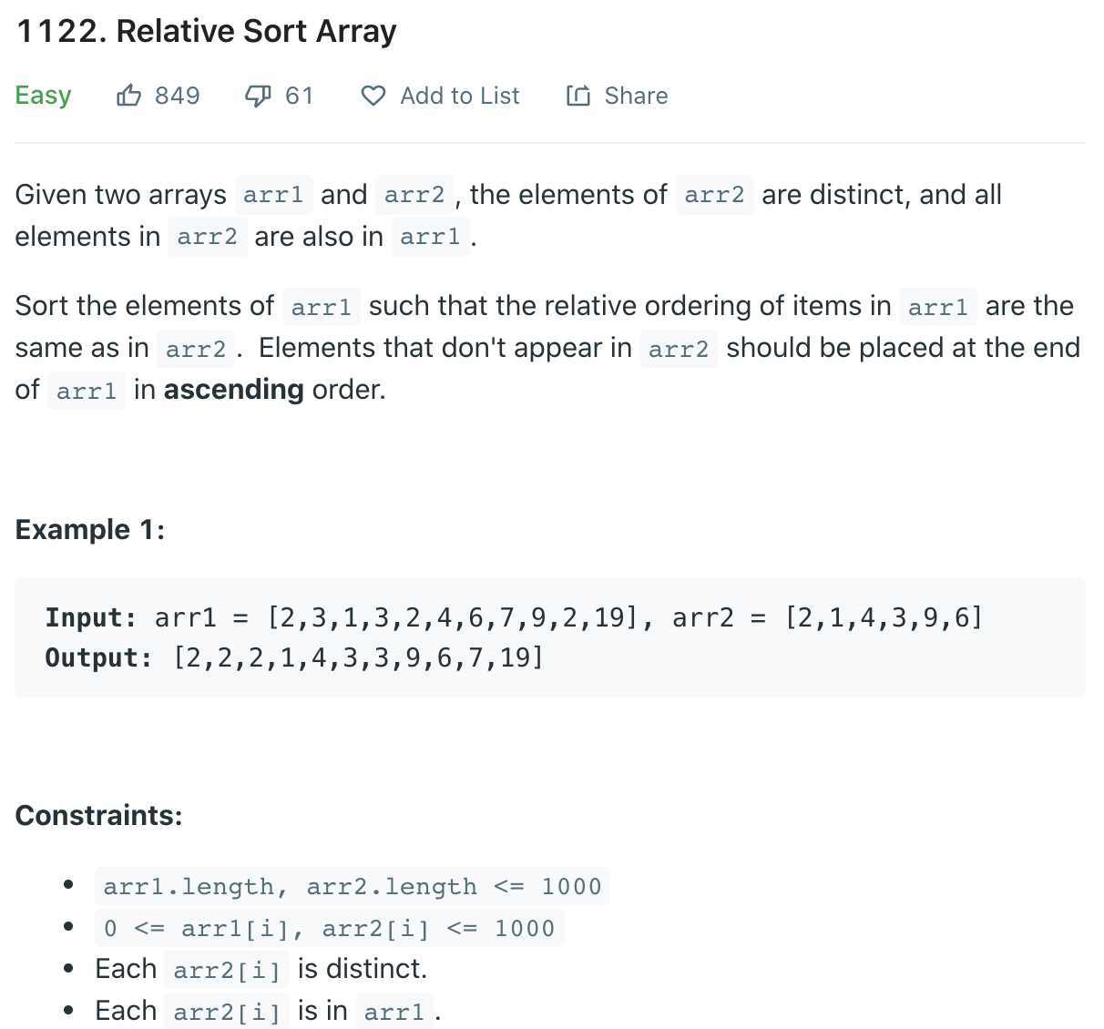 이 문제는 비교적 간단하다. 좋아요도 많다. 이것은 문제가 모호함이 없이 명쾌하다는 것이다. 문제를 요약하자면 다음과 같다. arr1, arr2 두개의 배열이 있다. arr1을 arr2의 기준으로 sorting하는 것이다. arr2의 모든 원소는 arr1에 포함되어있다. 하지만 arr1에는 arr2에 없는 원소도 있다. 이때, 이 원소들은 오름차순으로 sorting 된 arr1의 뒤에 붙이는 것이다. 위의 예제를 보면 이해가 된다. 이 문제에서 주의 할 점은 arr1에 같은 원소가 복수개로 주어질 수 있다는 것이다. 이것들은 sorting될 때 나란히 놓이게 되는 것이다.