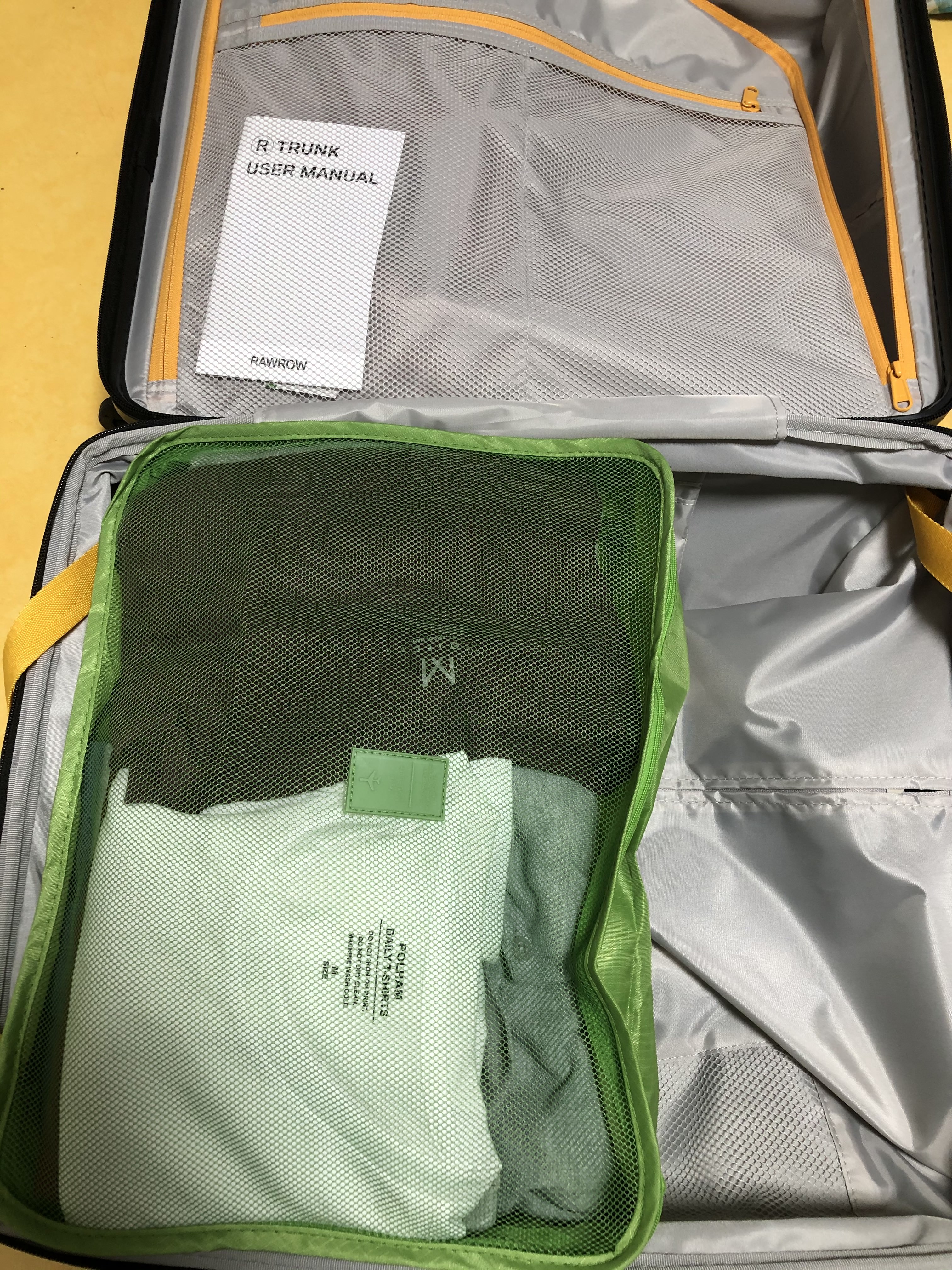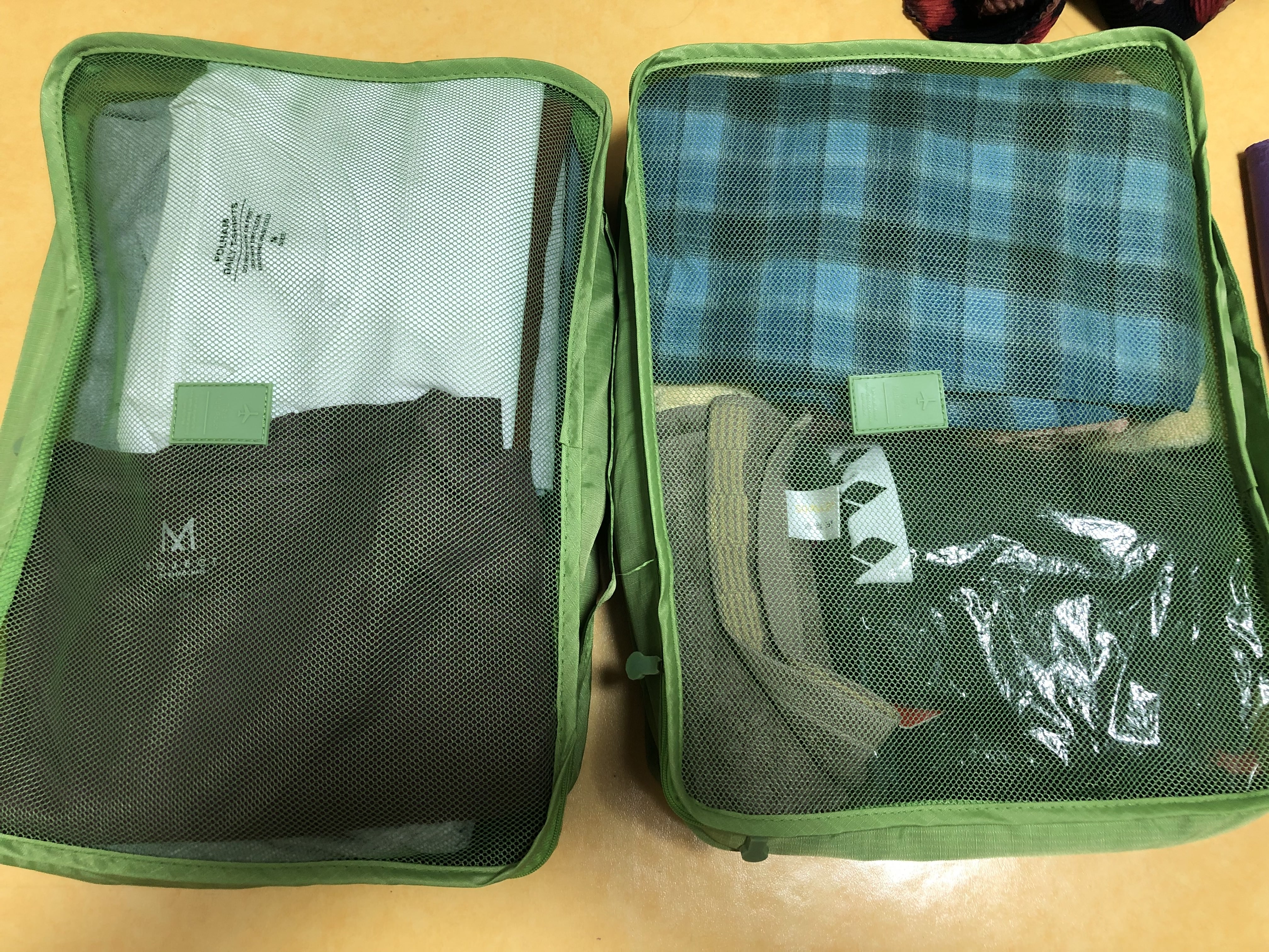 여러 색상이 있고 아래는 다른 색상의 큰 사이즈 (위 큰 파우치 보다 더 두꺼움) 파우치에 티셔츠와 반바지 수건, 수영복을 넣을 모습니다. 이렇게 짐을 싸고 캐리어에 벽돌 쌓듯이 혹은 책을 꽂듯이 넣으면 된다.