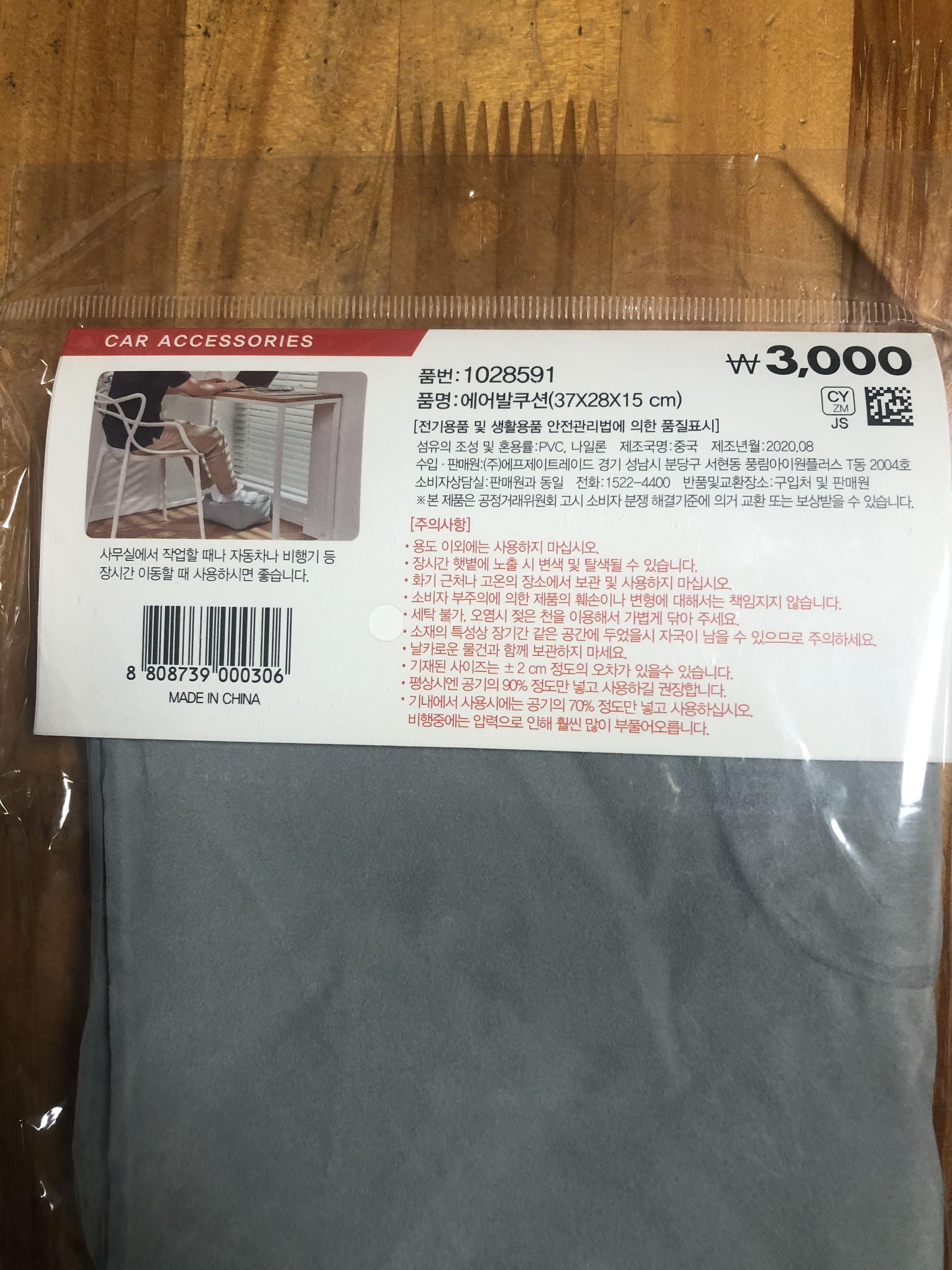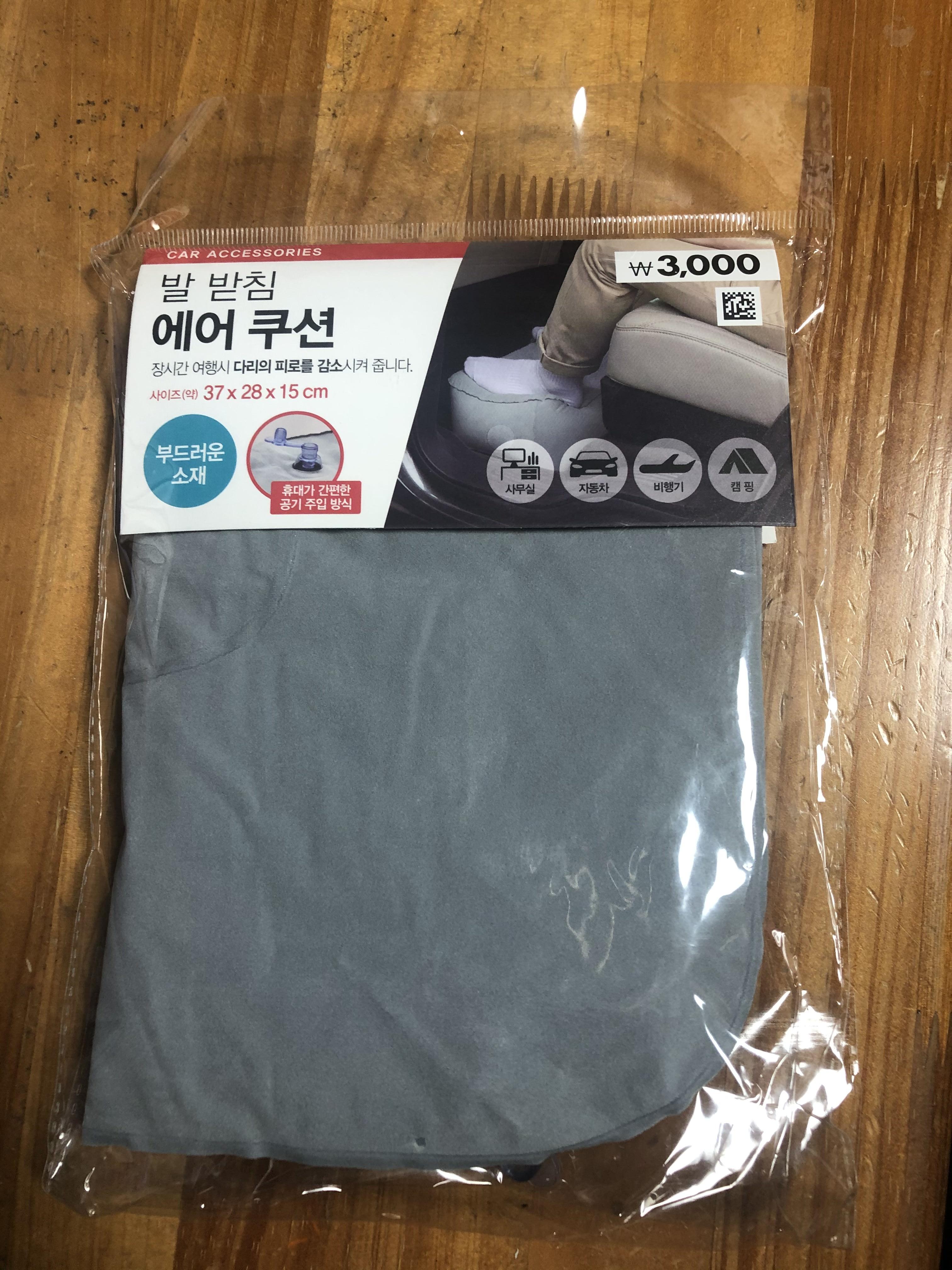 메쉬 파우치와 같은 코너에 있던 발받침 에어쿠션도 하나 데려왔다. 장시간 비행이나 사무실에서 발 올려놓으면 편할 것 같아 샀다. 바람은 직접 넣어야 하기에 아직 개봉하지 않았다. 출국해서 호텔에서 격리하기 시작할 때 개봉하기로 한다. 특별한 사용기는 없을 것 같지만 개봉하고 바람을 넣고 사진을 보강해야겠다.