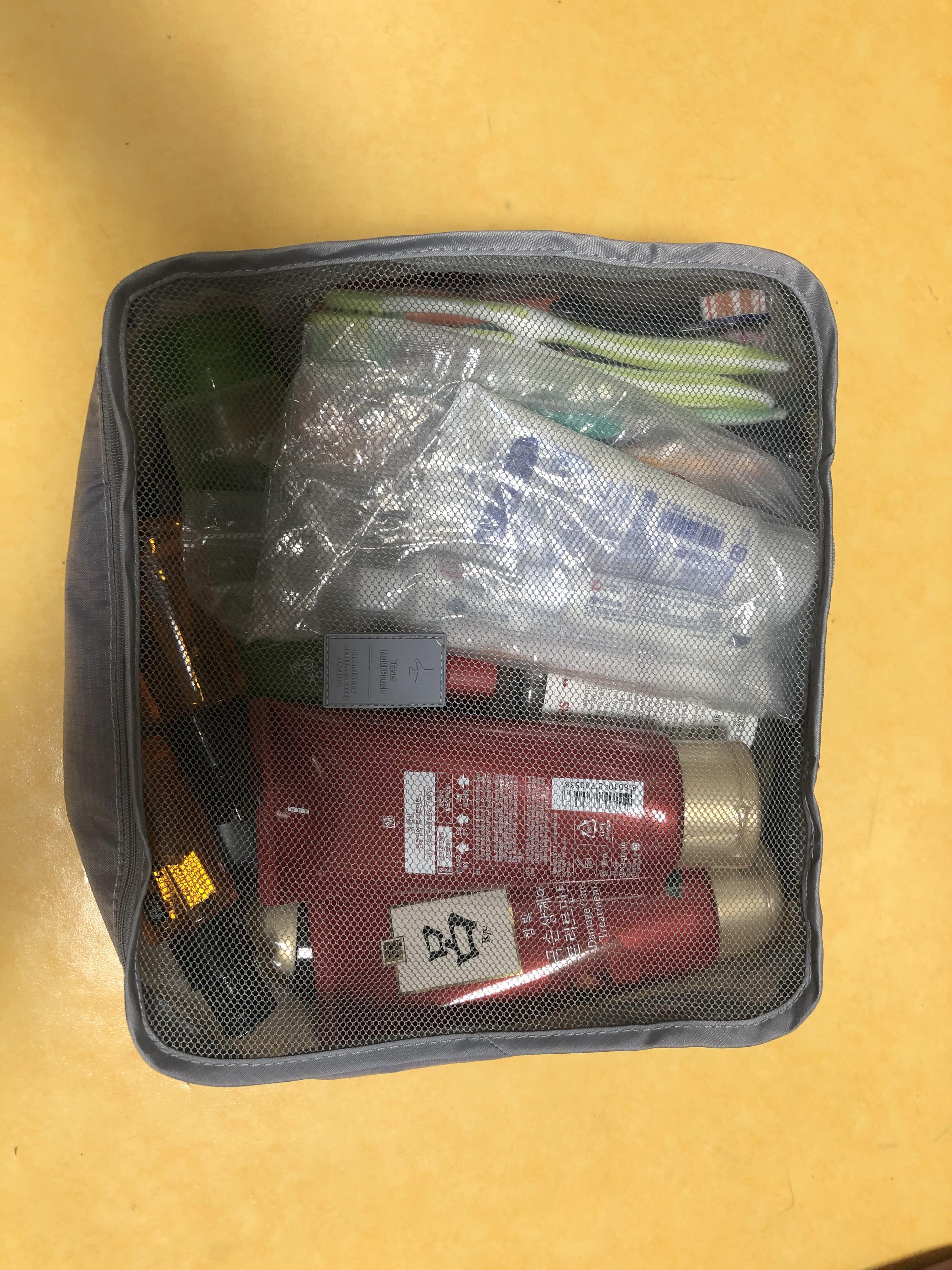 위에는 손잡이도 있다. 그리고 작은 사이즈의 파우치에는 칫솔, 치약 및 세안제 샴푸 등 욕실 용품을 넣어봤다. 이것들을 다 넣으면 무게가 좀 나간다. 파우치가 아주 튼튼해 보이진 않지만 조심히 들면 찢어지지 않게 짐을 쌀 수 있겠다.