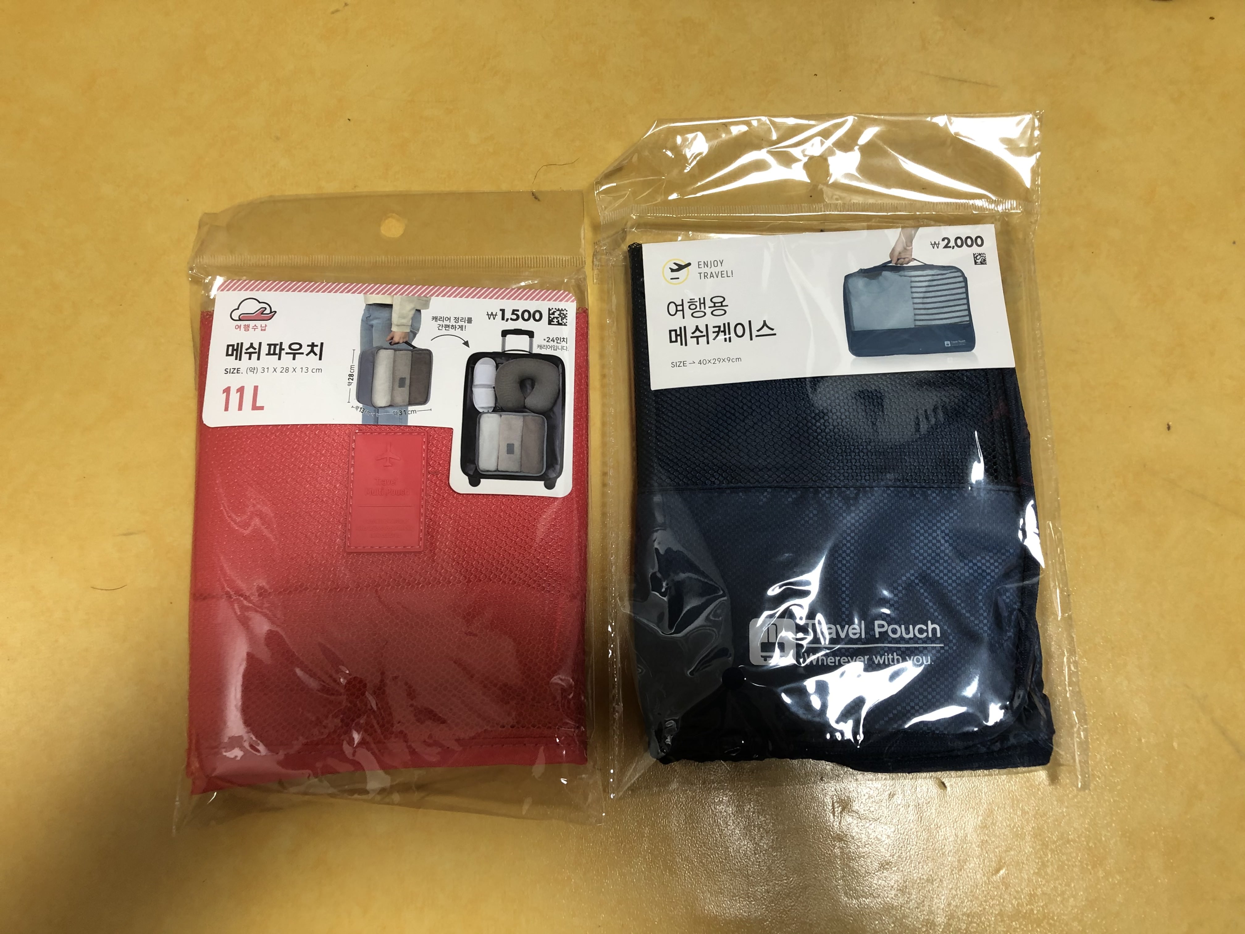 근처 다이소에는 아래처럼 만든 회사는 다르지만 두가지 사이즈의 파우치가 있었다. 왼쪽의 진한 분홍색 파우치의 사이즈는 31 x 28 x 13cm이다. 오른쪽 진청색의 파우치는 40 x 29 x 9cm이다. 오른쪽 것이 면적은 크지만 폭은 왼쪽보다 작다.