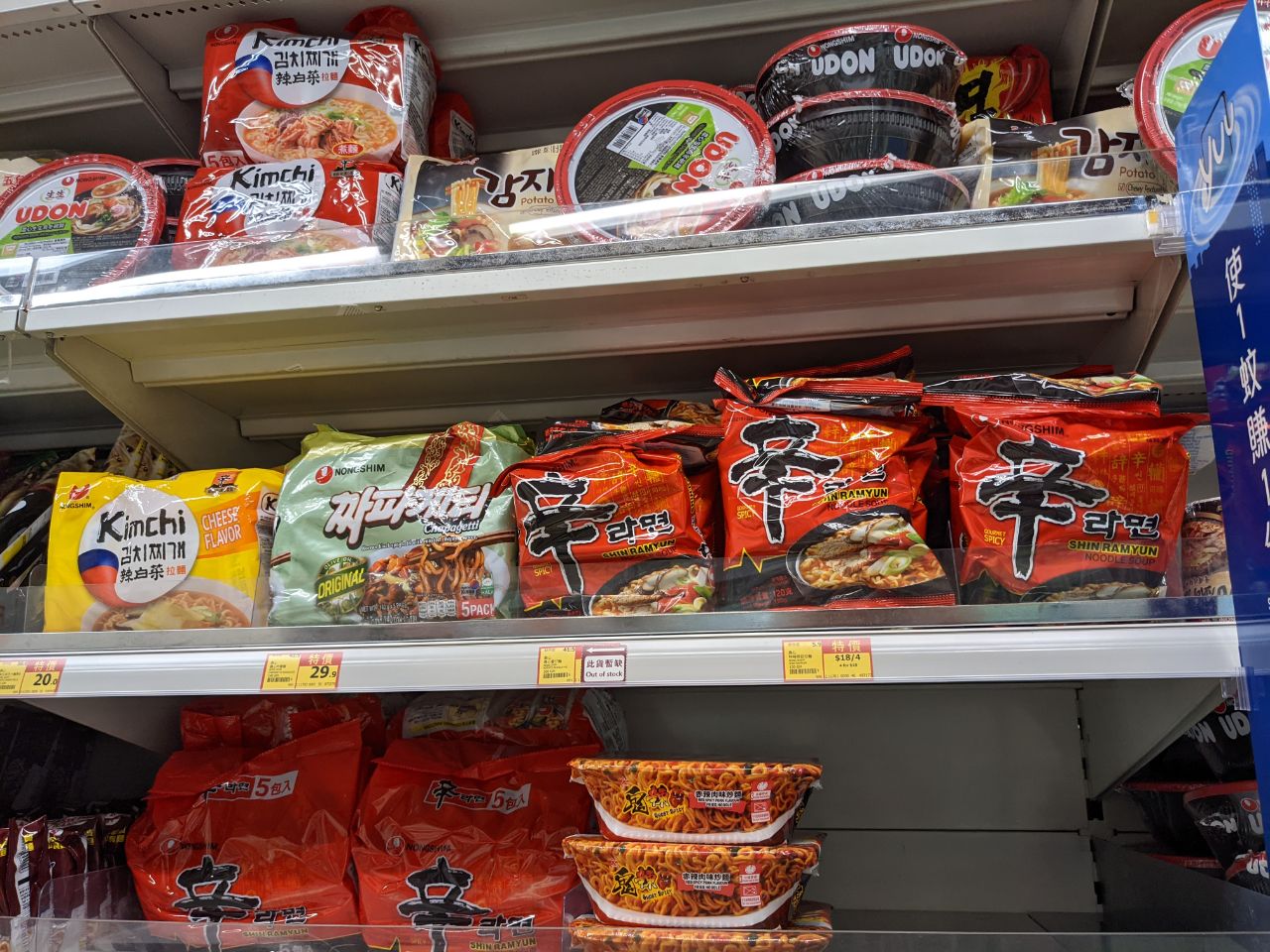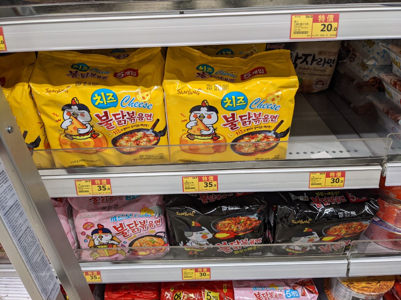 드디어 라면 코너, 중화권에서 한국 라면이 인기가 있다. 신라면도 그렇고, 특히 불닭볶음면 시리즈가 아주 인기가 높다고 한다. 한국의 매운맛을 좋아하는 모양이다. 짜파게티가 있는 것을 발견하고 이상하게 갑자기 마음이 편안해진다. 집에 있는 날 간단하게 점심을 때우기 딱 좋은 짜파게티이다.