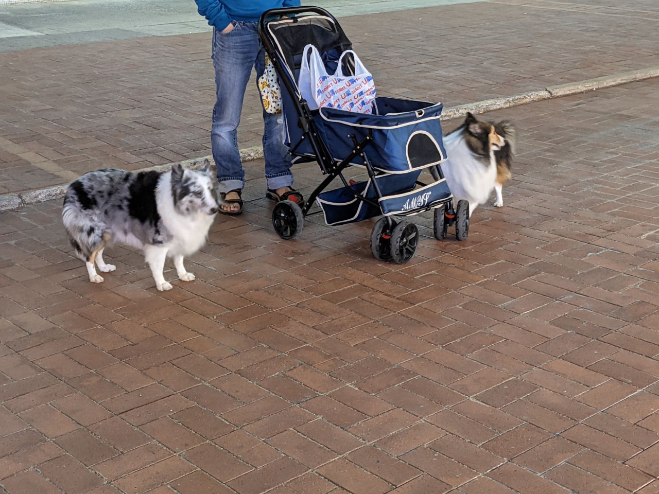 마트 앞에 특이하게 생긴 개를 데리고 장을 보러 나온 사람이 서있다.