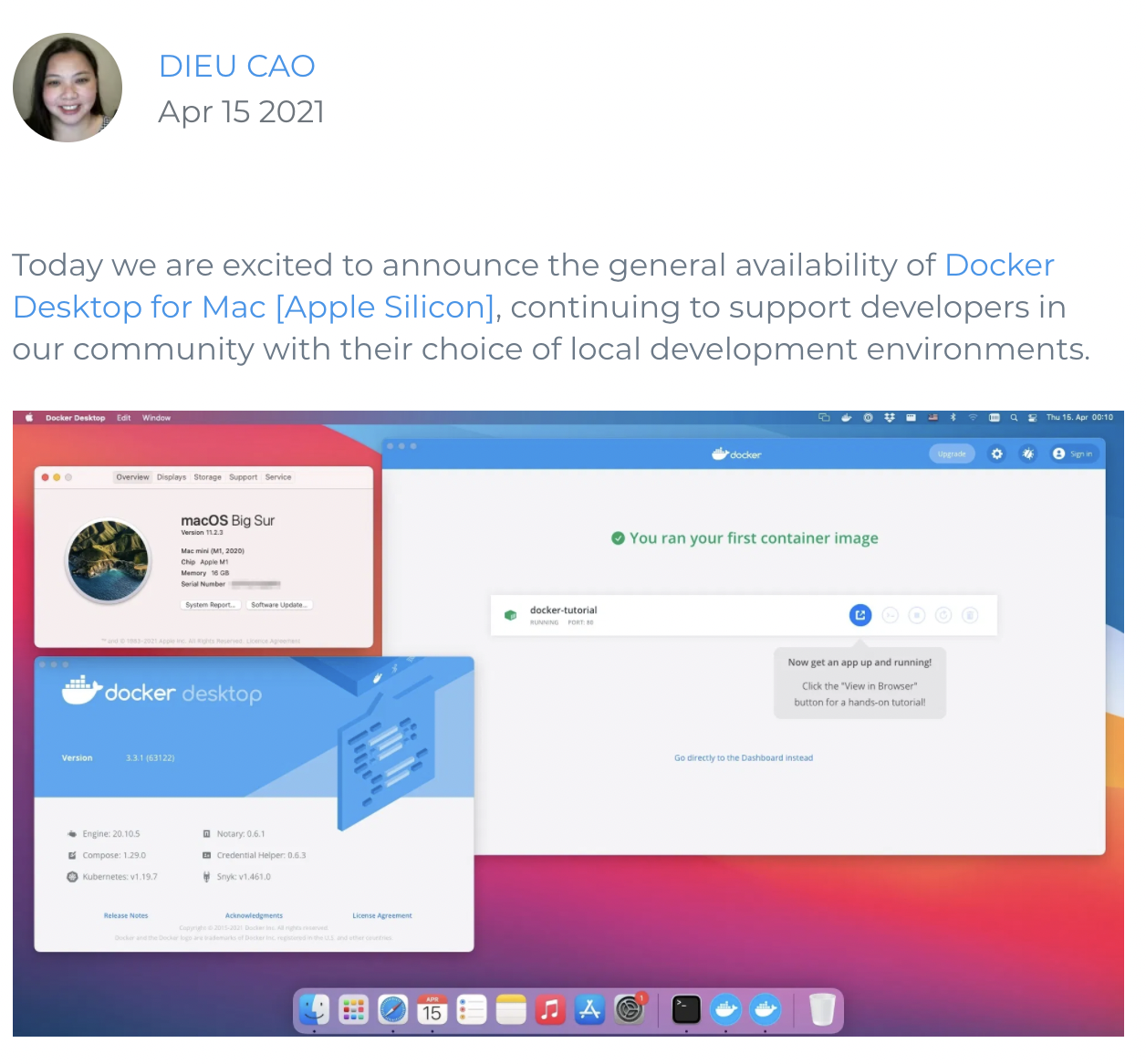 2021년 4월 15일, Docker Inc는 M1 맥용을 위한 docker desktop이 나왔다는 소식을 전했다. M1 맥북 에어 유저로서 반가운 소식이 아닐 수 없는 것이, 그간 Rosetta로 docker를 사용했었는데, 애플 실리콘을 지원하지 않는 image들이 있어 인텔 맥북을 동시에 사용하는 불편함을 겪고 있었기 때문이다. 특히, SQL server 구축을 할 수 없는 점이 아쉬웠었는데, 이번 업데이트를 통해 드디어 M1 맥에서도 docker를 네이티브로 사용할 수 있게 되었다.