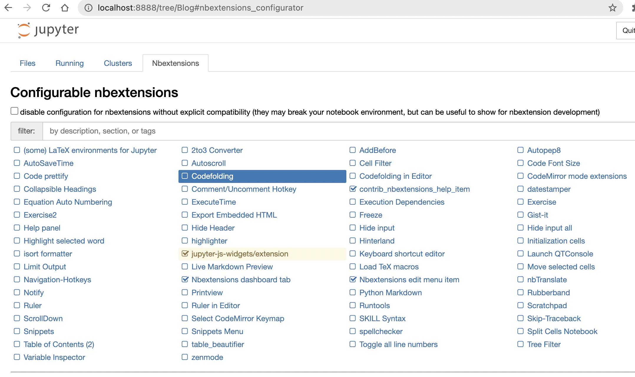 jupyter notebook 서버 재실행 후, Nbextensions탭이 생긴 것을 확인하고 하위 목록에서 Codefolding를 체크해준다.
