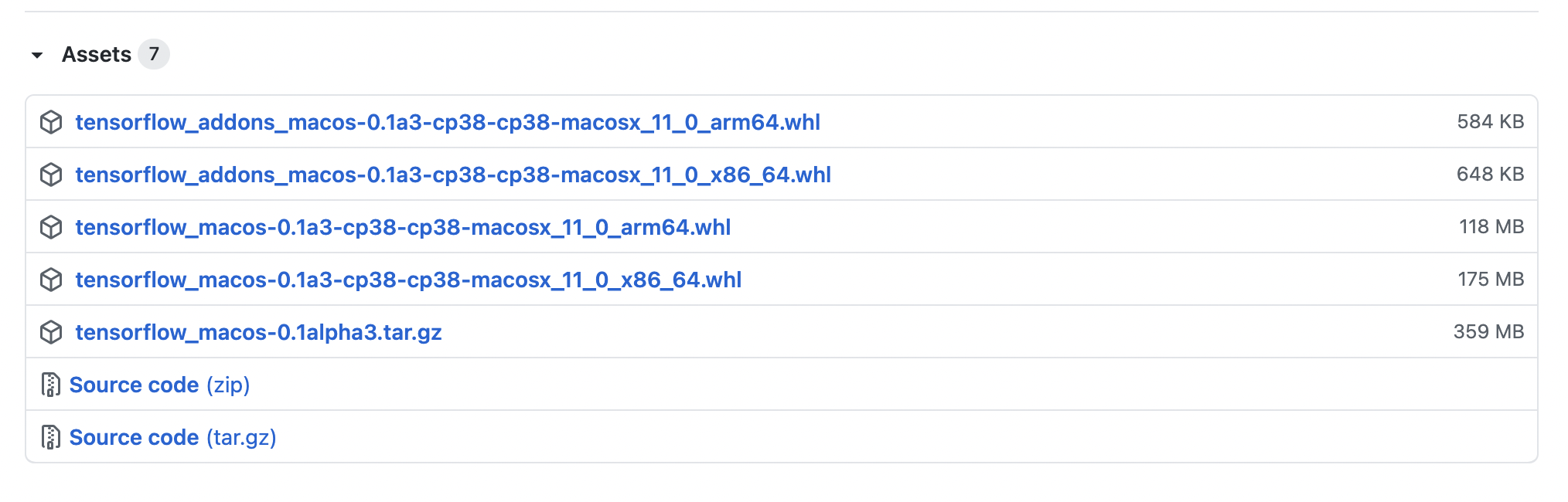 github.com/apple/tensorflow_macos/releases 이 링크에서 Assets 메뉴를 펼치면 내려받을 수 있는 파일들이 있다.