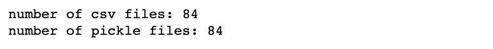 참고로 이 테스트는 M1 맥북 에어로 진행하였다. 두 다른 형식의 파일의 로딩의 성능을 비교하는 것이니 걸린 시간의 상대적 차이가 중요할 것이다. 우선, 준비한 csv와 pickle파일들의 이름을 각기 다른 리스트 변수에 저장한다. 각각 84개의 파일이 있고, 이 두 그룹의 데이터는 서로 동일하다.