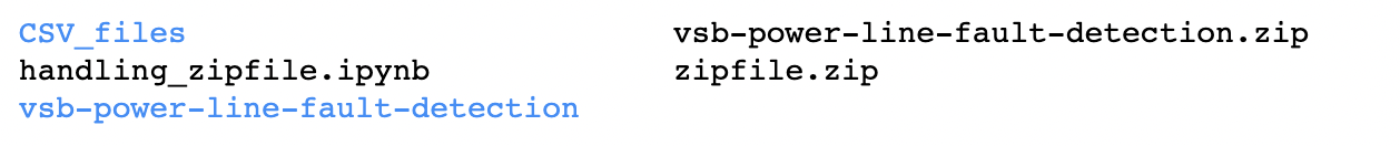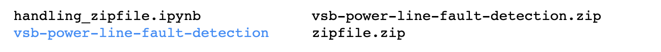 zipFile의 extractall()이라는 메서드를 이용해 압축을 풀 수 있고, input argument로 압축을 풀 디렉토리 이름을 줄 수 있다. 그러면 압축 해제된 파일들이 지정된 디렉토리에 위치하게 된다. 다음과 같이 실행하여 vsb-power-line-fault-detection.zip 파일을 vsb-power-line-fault-detection이라는 디렉토리에 압축을 풀어준다.