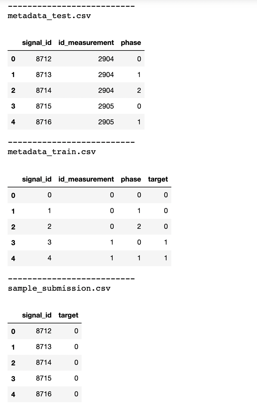 이번에는 여러 csv파일이 압축된 zip 파일로부터 각각의 csv 데이터를 압축을 풀지 않은 채로 로딩해보자. 'vsb-power-line-fault-detection.zip'에서 세 개의 csv파일을 압축 해제 없이 읽어 들인다.
