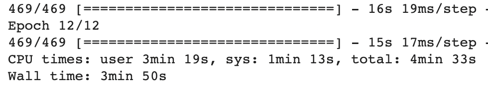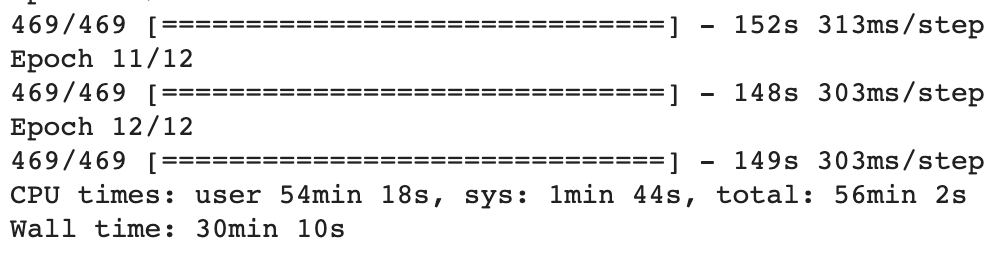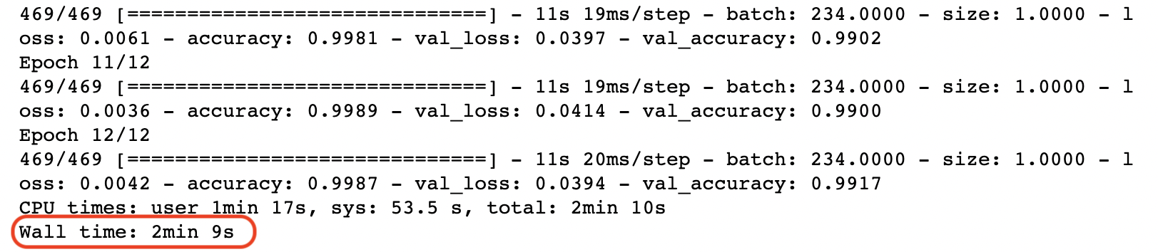 훈련이 끝났다. 128의 batch size로 12 epoch로 실행했고, 걸린 시간은 2분 9초로 나온다.