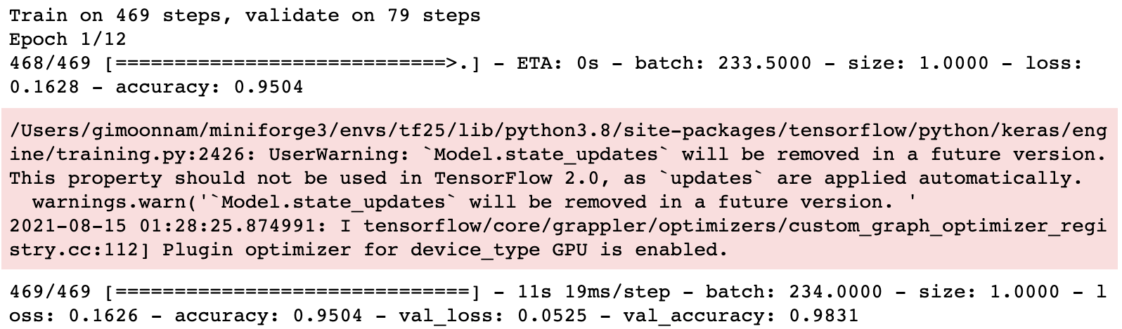 이로써 모든 준비가 끝났다. 이제 M1 맥북의 GPU에서 Tensorflow를 이용해 모델을 훈련해보고 시간을 비교해 보자.