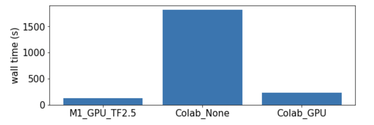 세 결과를 비교하니 M1 GPU가 colab의 GPU보다는 두 배, hardware accelerator 없는 경우보다는 15배 정도 빠른 것으로 나왔다. 놀라운 결과이다. 이제 tensorflow를 M1 GPU에서 실행할 수 있게 되었다.