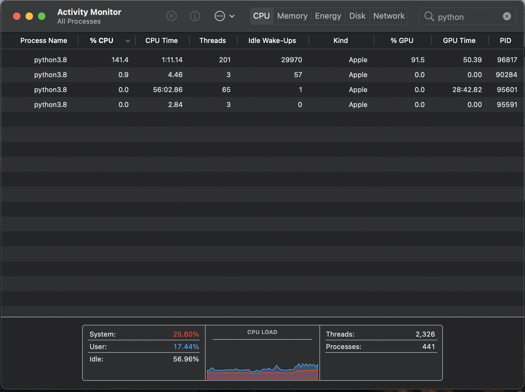 훈련이 진행되는 동안 Activity Monitor를 열고 GPU를 사용하고 있는지를 확인한다. 90% 이상의 로드로 계산이 진행되고 있다고 나온다. 드디어 M1 맥북의 로컬 GPU에서 tensorflow를 실행할 수 있게 되었다.