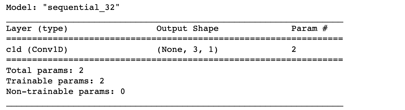 2개의 변수가 있는 것을 확인한다. 이 두 변수가 Conv1D layer의 가중치이고, 훈련을 할수록 kernel 값인 1,2 값에 맞춰질 것이다.