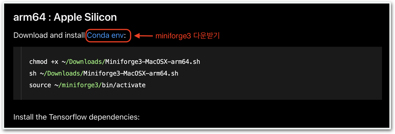 다음의 링크에서 miniforge를 설치한다. (https://developer.apple.com/metal/tensorflow-plugin/)