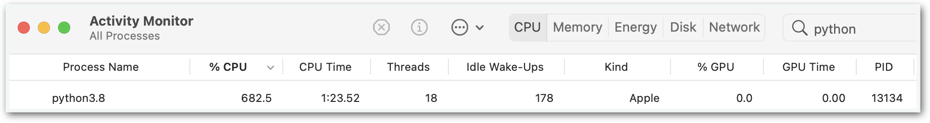 Activity Monitor상에서 Apple CPU에서 코드가 잘 돌아가고 있는 것을 확인할 수 있다.