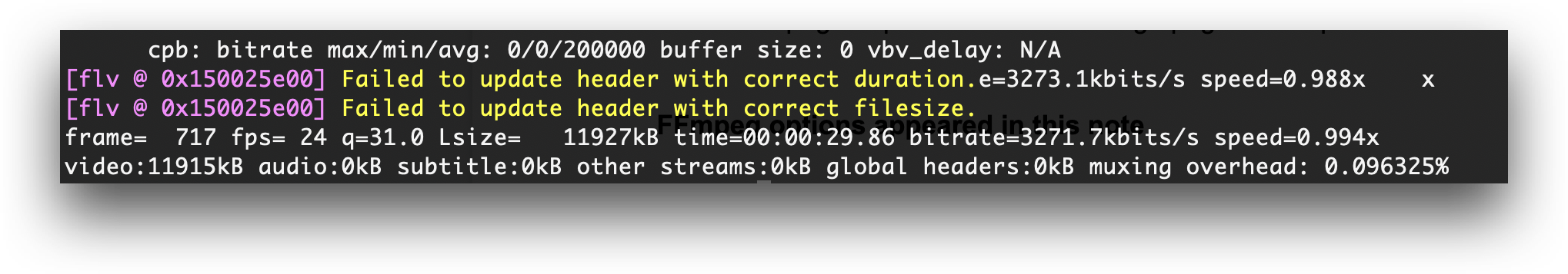 [flv @ 0x14201a800] Failed to update header with correct filesize.