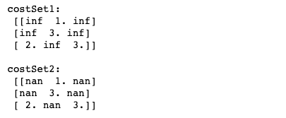 inf의 원소를 가지는 costSet1과 NaN이 들어 있는 costSet2를 만든다.