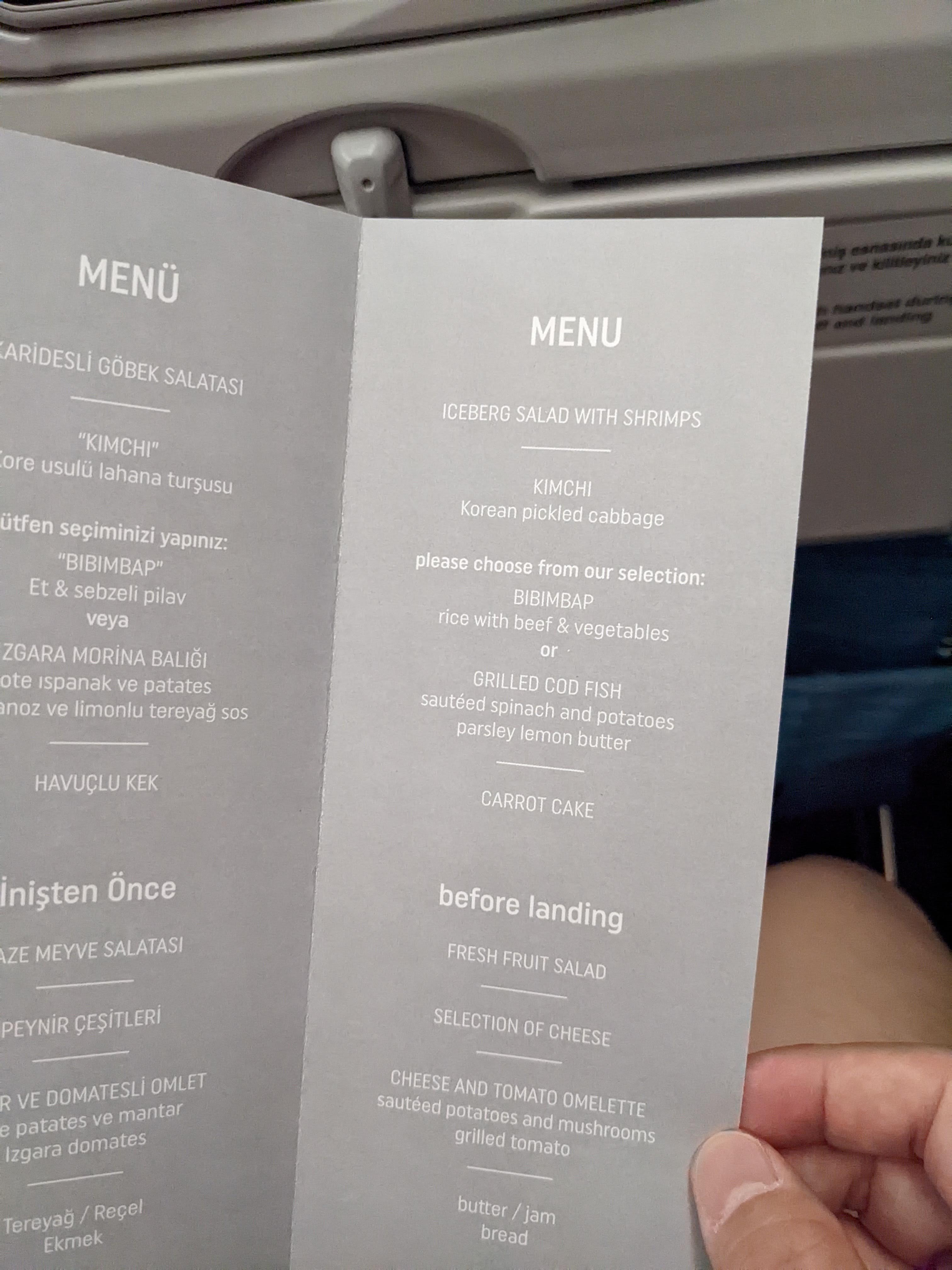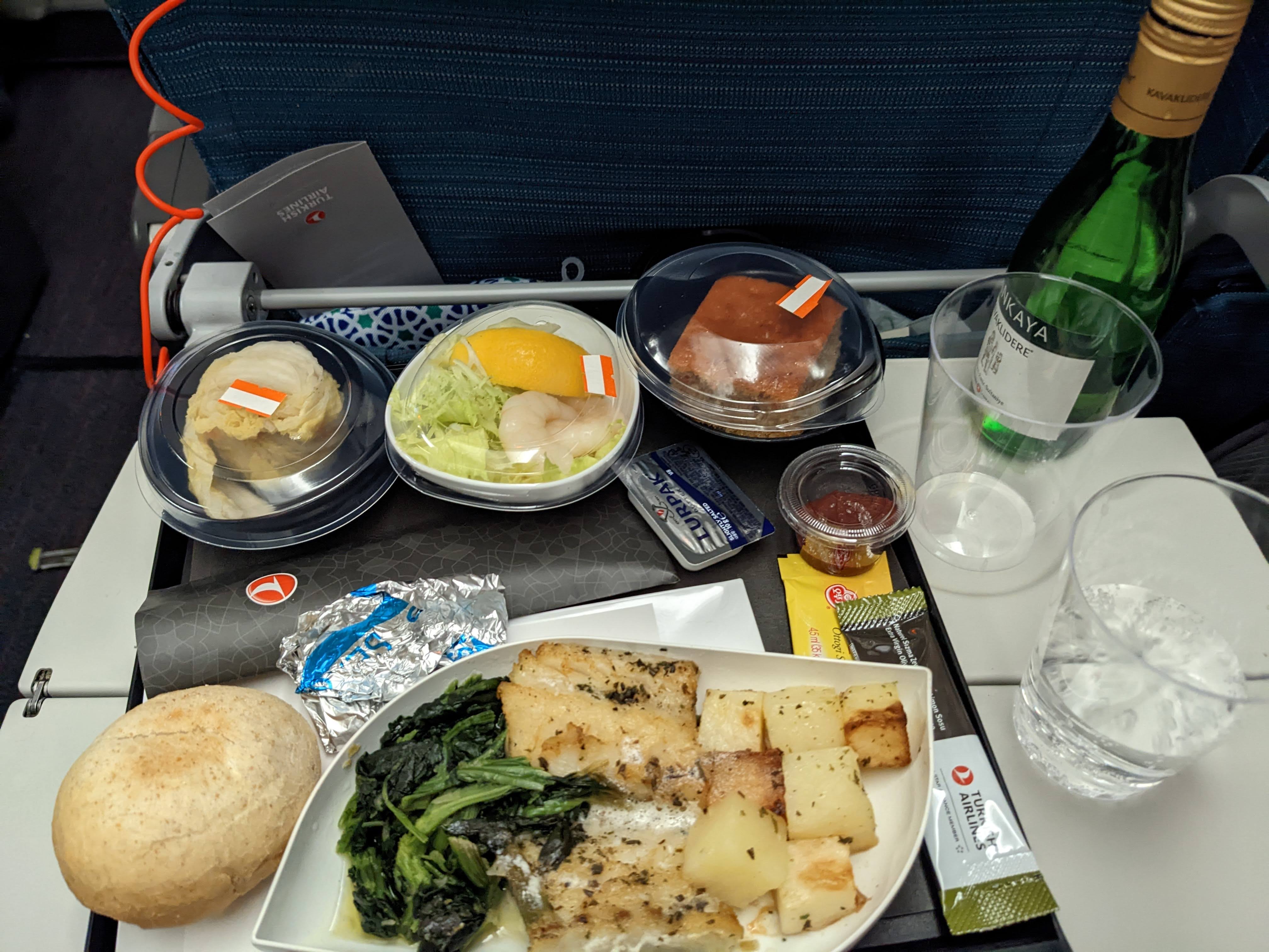 첫 번째 기내식은 비빔밥과 대구 (cod)생선 중에 하나를 고를 수 있다. 생선과 화이트 와인을 받았다.