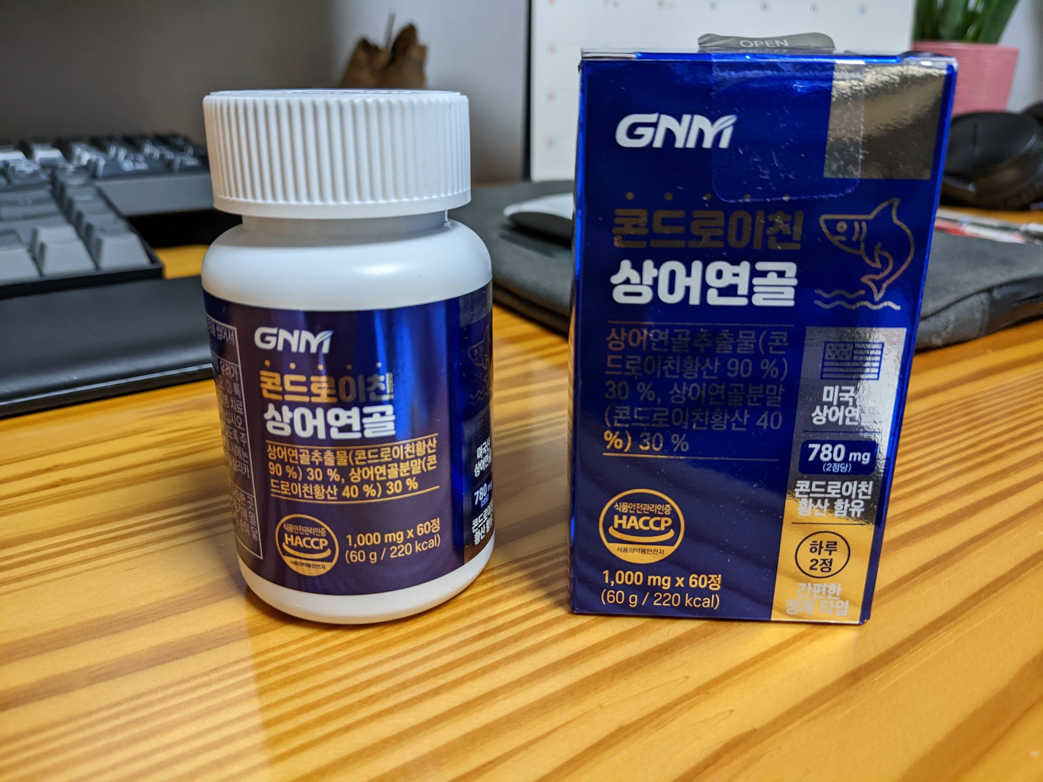 어떤 제품이 좋은지 모르니 일단 쿠팡에서 무난해 보이는 HACCP 식품안전관리 인증을 받은 GNM 콘드로이친을 주문해 보았다. 보스웰리아 비타민D도 함유되어있다고 광고하고 있다. 한통에 60정 세 통에 약 47000원이다.