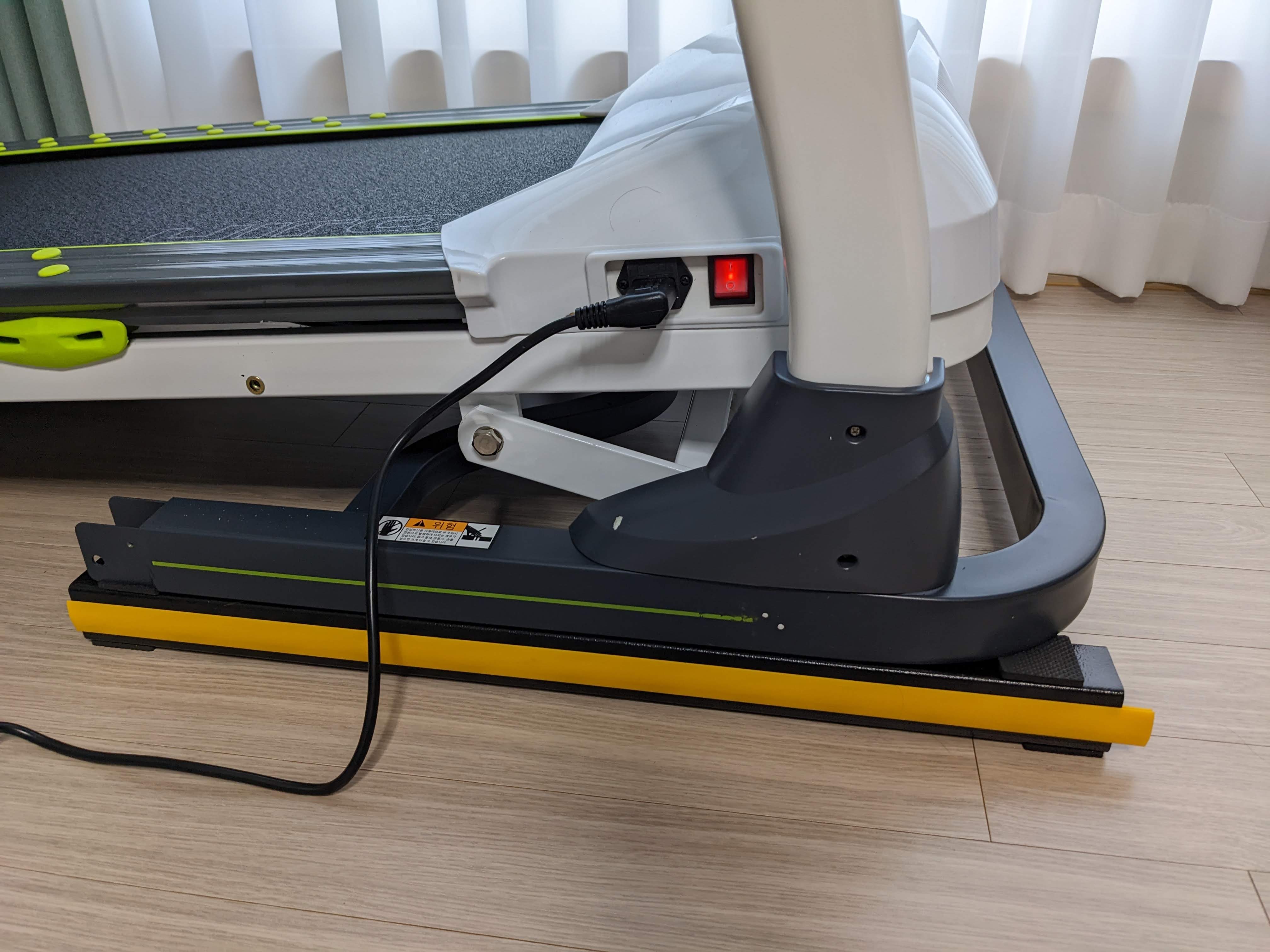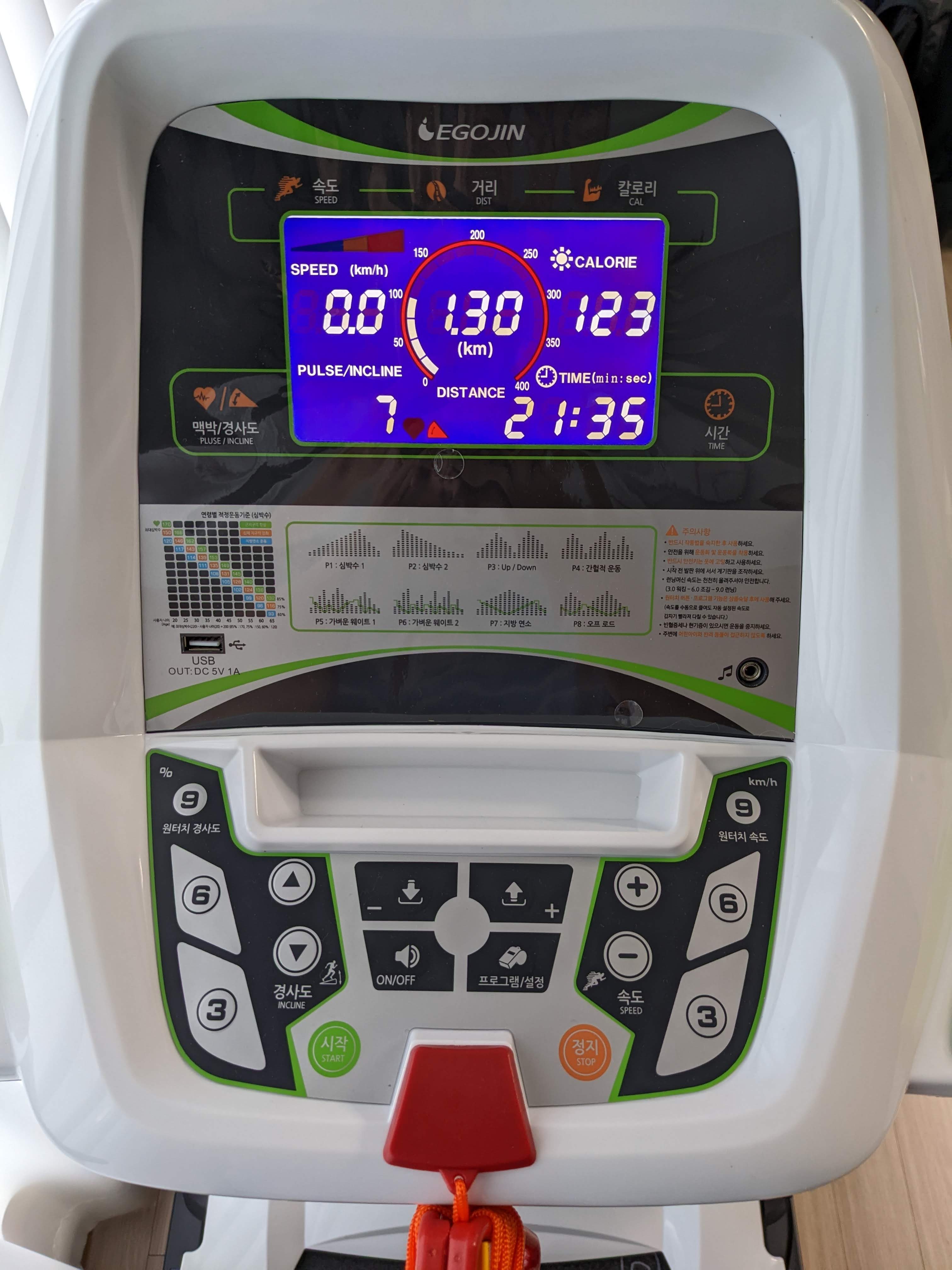 컨트롤 패널의 디자인이 나쁘지 않다. 보기 편하게 구성되어 있다. 맨 아래에 있는 빨간 뚜껑으로 보이는 덮개는 응급 정지 핀이다. 작동중 저 핀을 제거하면 작동이 멈추고, 핀이 붙어 있지 않으면 러닝머신이 작동하지 않게 되어있다.