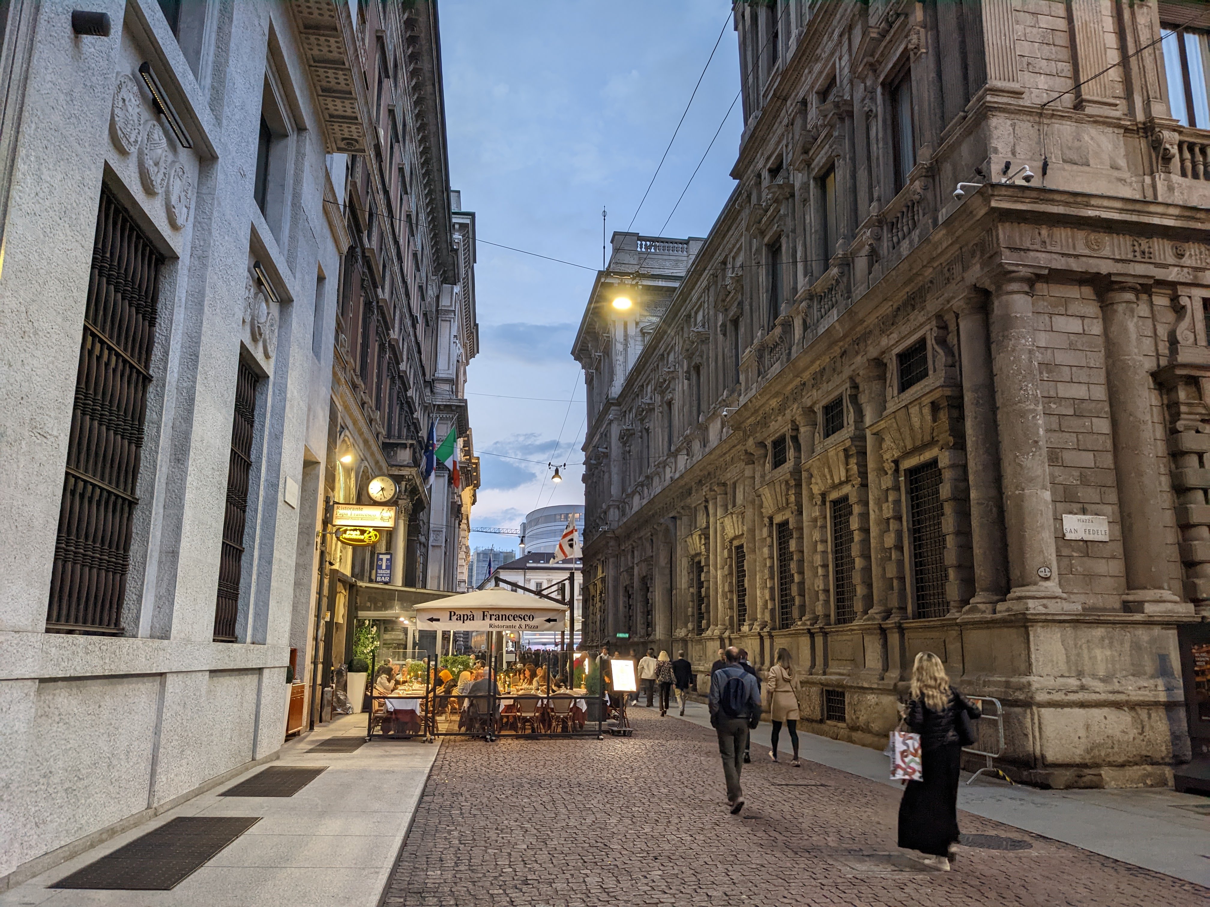 두오모 근처에서 저녁을 먹으려 레스토랑을 찾으며 약간 돌아다니다 괜찮아 보이는 곳을 하나 발견했다. 레스토랑 이름 파파 프란체스코(Ristorante Papa Francesco)이고, 두오모 옆 비토리오 엠마누엘 갤러리 뒤쪽에 있다. 이곳 골목에 레스토랑과 카페들이 있어 아늑하고 편안한 분위기를 준다.