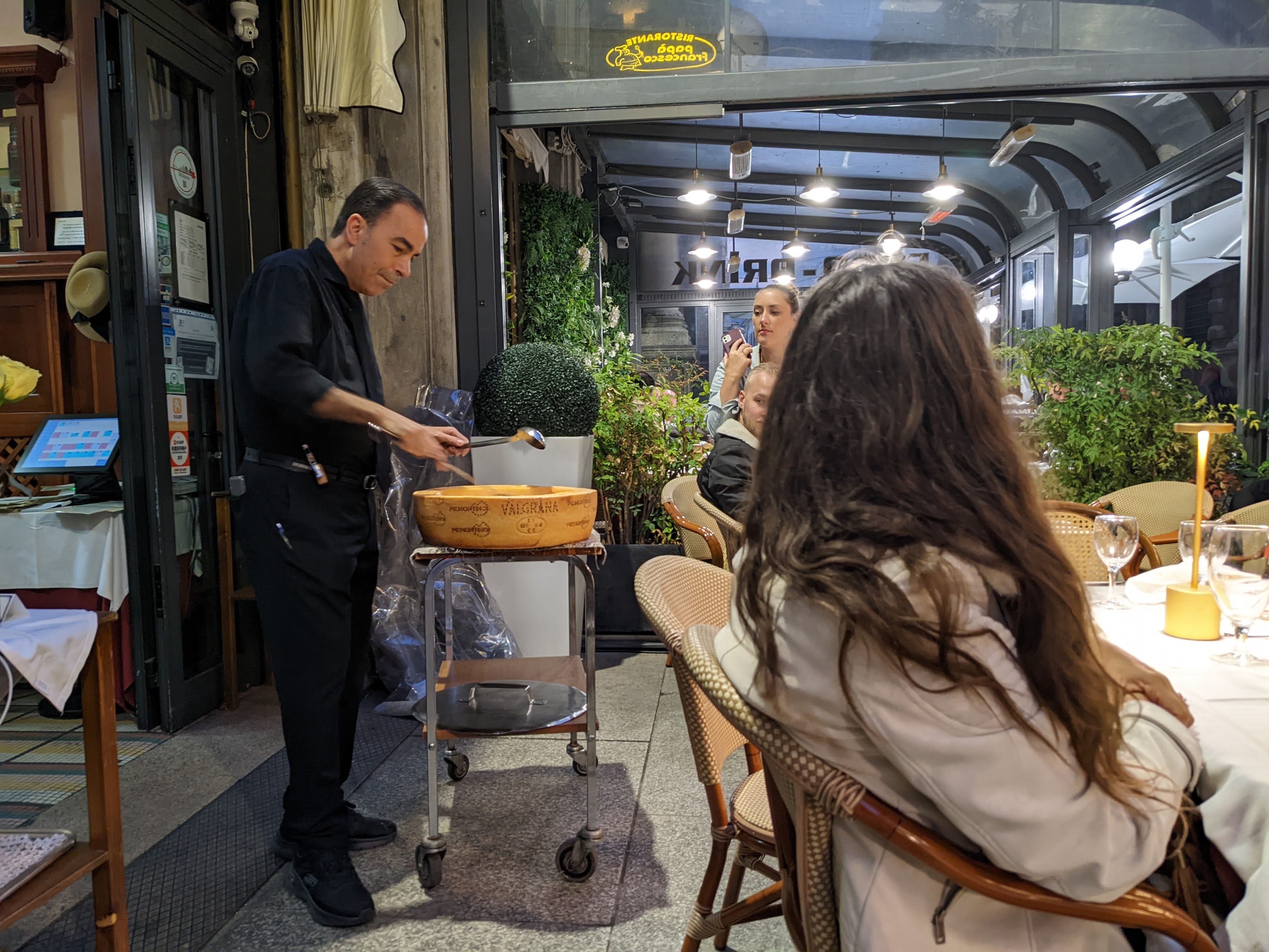 메뉴를 고르고 있는데 옆에서 갑자기 저런 통치즈를 파낸 통을 들고와서 그 위에서 파스타를 요리하기 시작한다.