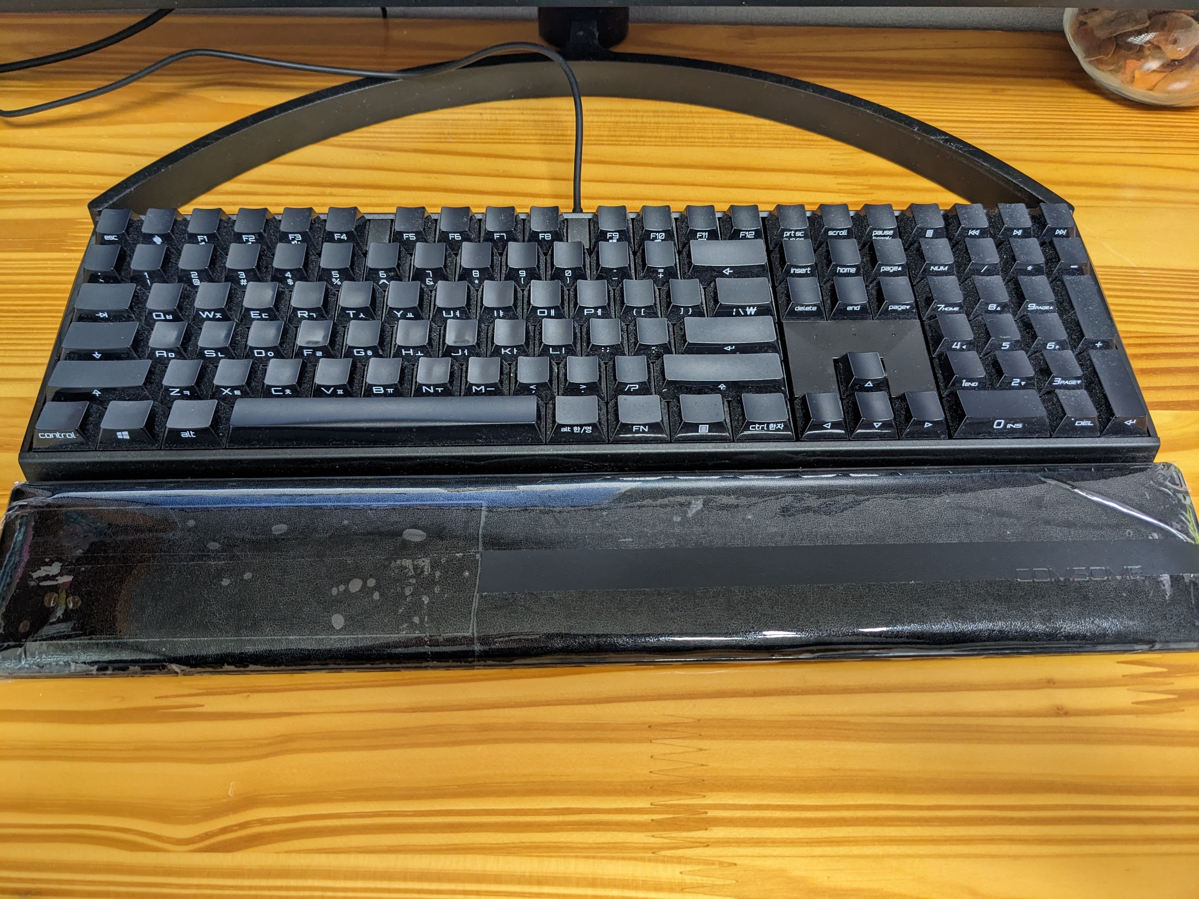 전에 쓰던 팜레스트이다. 가죽이 삭아 떨어지길래 테이프로 감아 놓았다. 체리 기계식 키보드와 색은 맞지만 통일성 없이 지저분해 보인다.