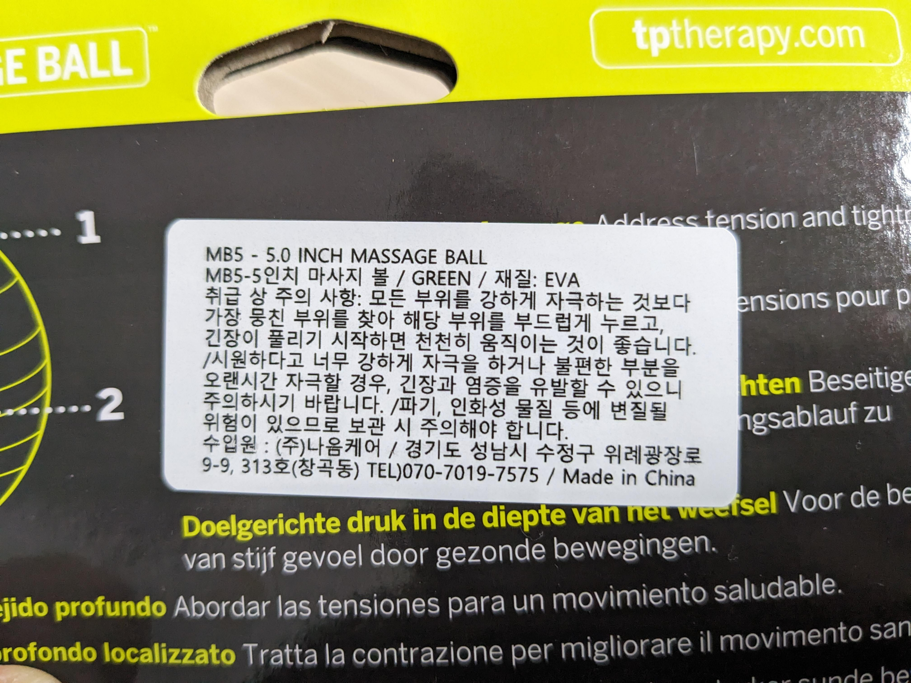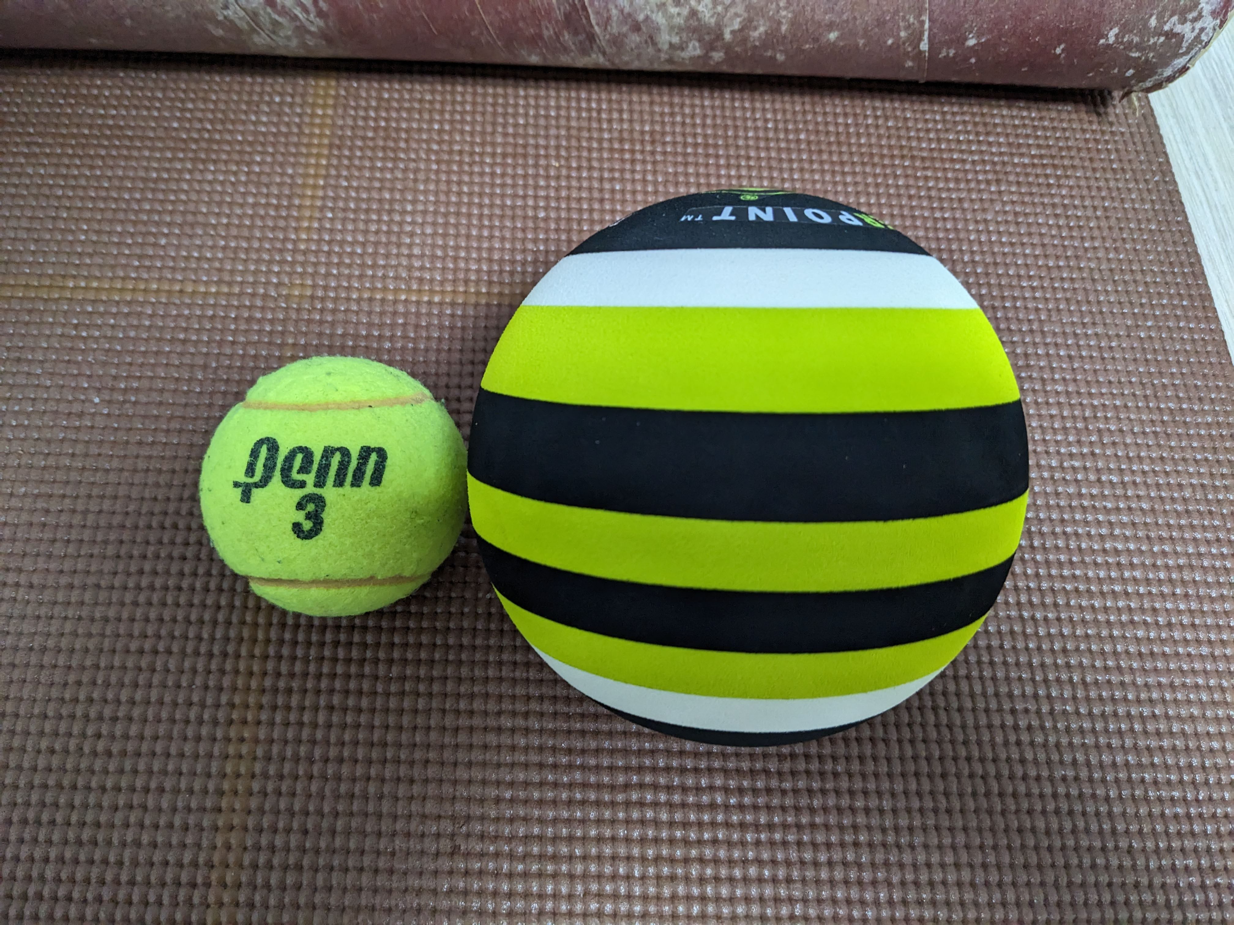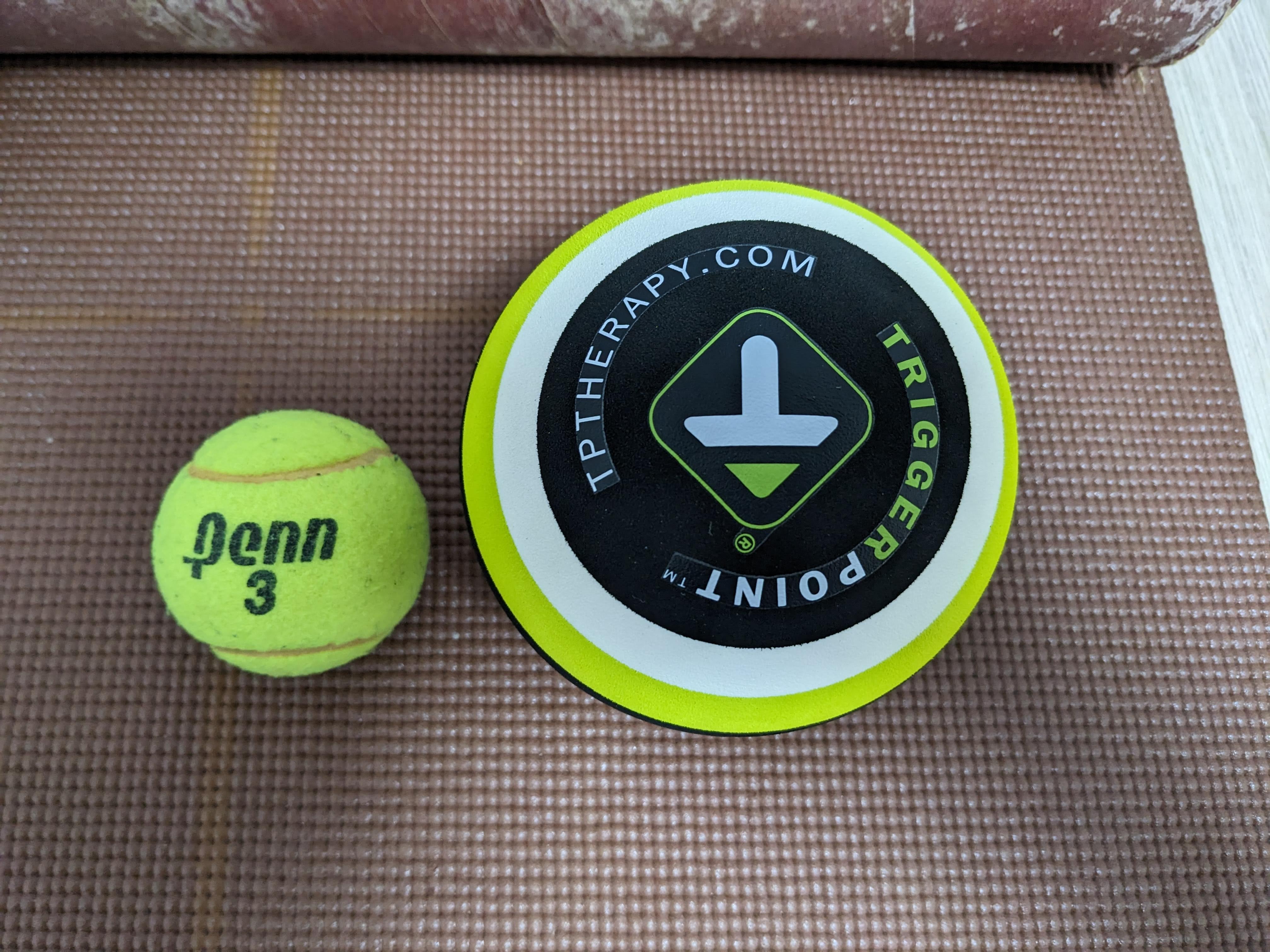 이름은 트리거 포인트 MB5 라크로스 마사지볼 12.7cm이다. 테니스 공과 비교해 보면 크기를 가늠해 볼 수 있다.