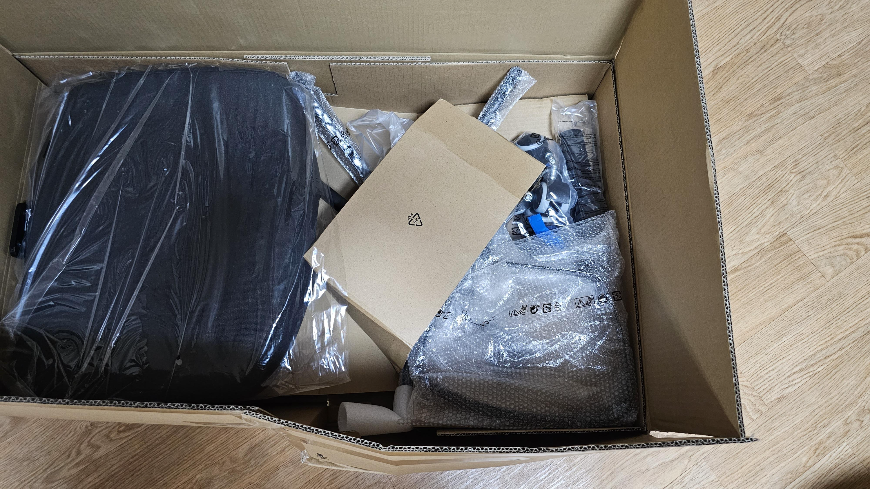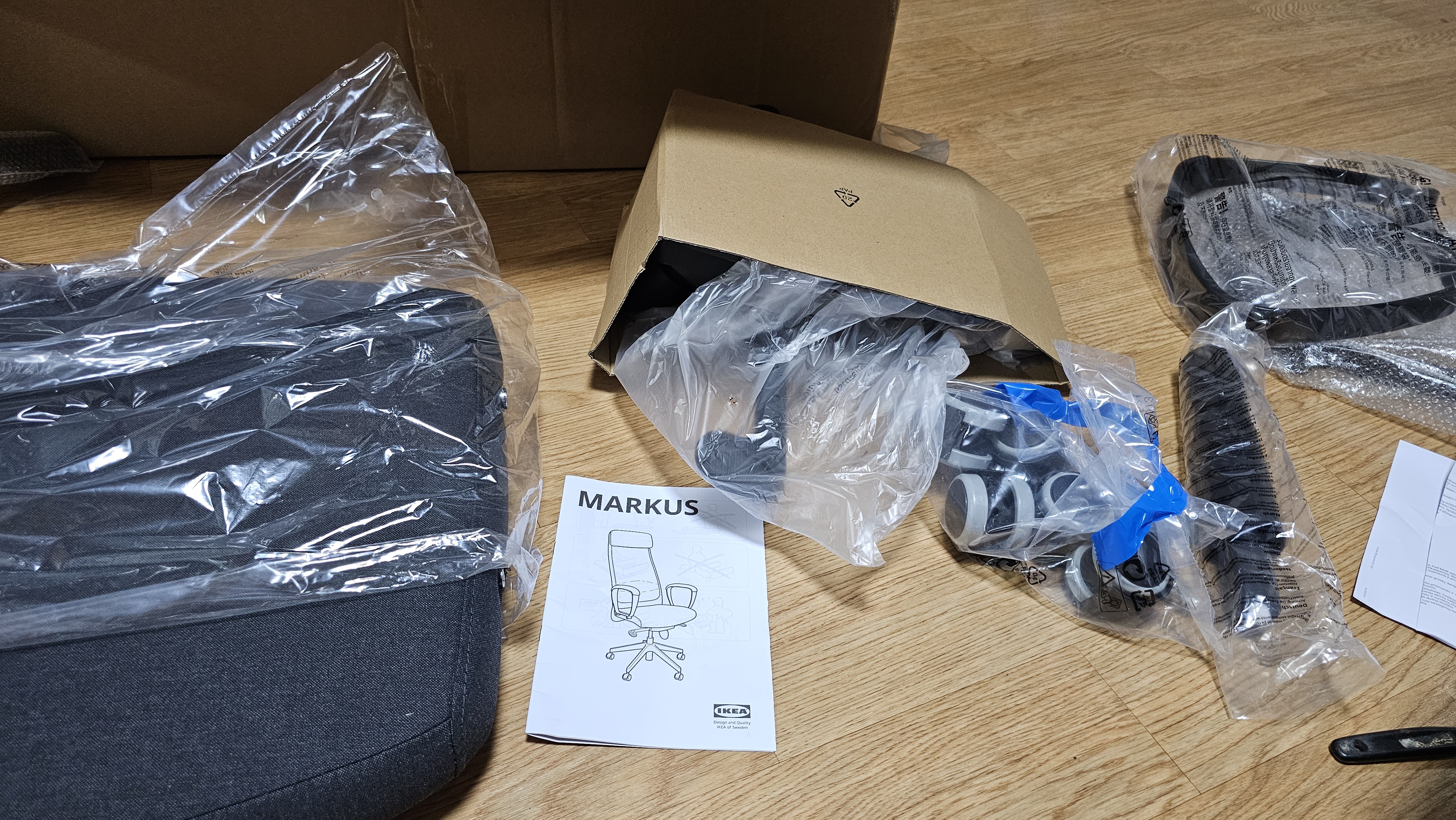 언박싱을 하면 여러 부품들이 나오고, 이케아의 의자는 다른 제품에 비하면 조립이 어렵지 않다.